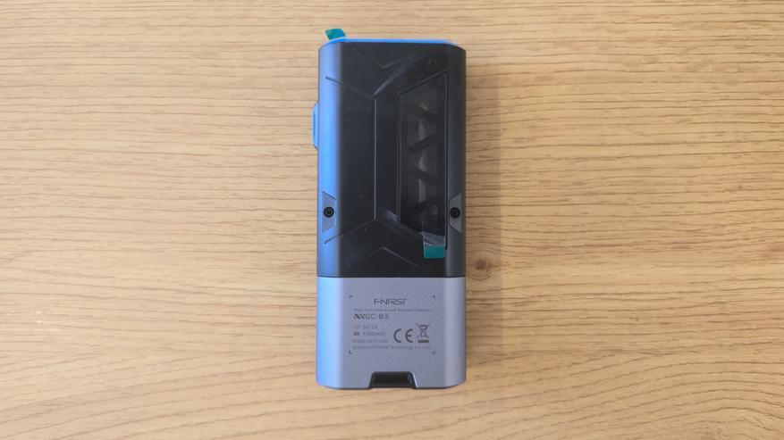 Fnirsi GC-03 выполнен в корпусе прямоугольной формы с закругленными гранями. На лицевой стороне основное место занимает цветной экран диагональю 2.4 дюйма. Ниже расположены органы управления: две квадратные кнопки и поворотное колесо с нажатием. Одна кнопка используется для возврата, вторая совмещена с функцией ОК и переходом в меню, а колесо позволяет перемещаться по пунктам и подтверждать выбор. Чуть выше дисплея заметна длинная горизонтальная прорезь светодиодного индикатора, который является визуальным индикатором сигнализации.