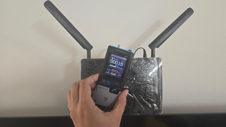 Дальше очередь дошла до роутера. В обычном режиме поле держалось около 200-230 V/m, а в момент активной передачи GC-03 показал 295 V/m по электрическому каналу. Магнитное поле оставалось на нуле. Получается, беспроводная техника действительно создает заметный фон, но тревога снова осталась только на дисплее.