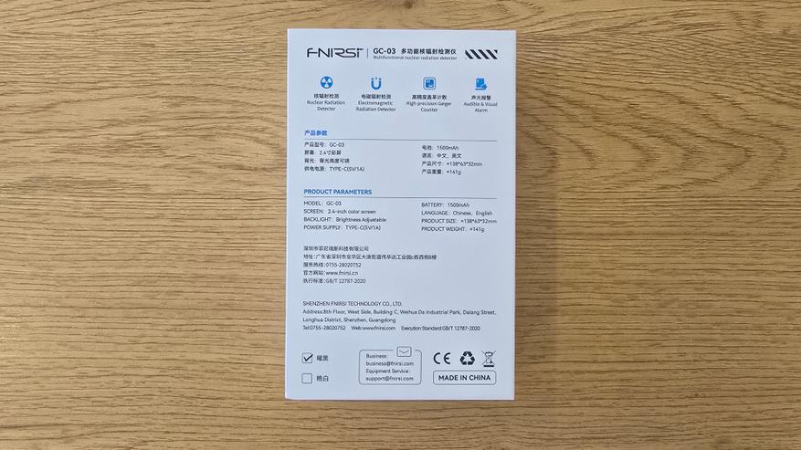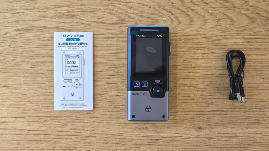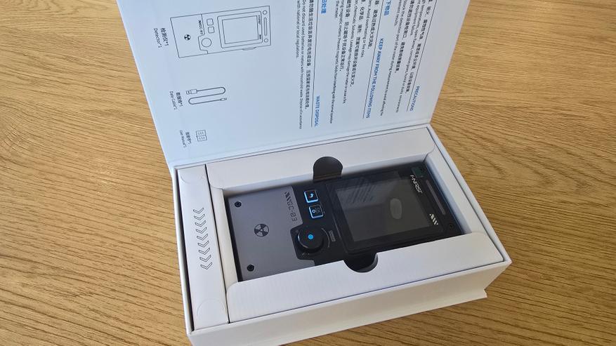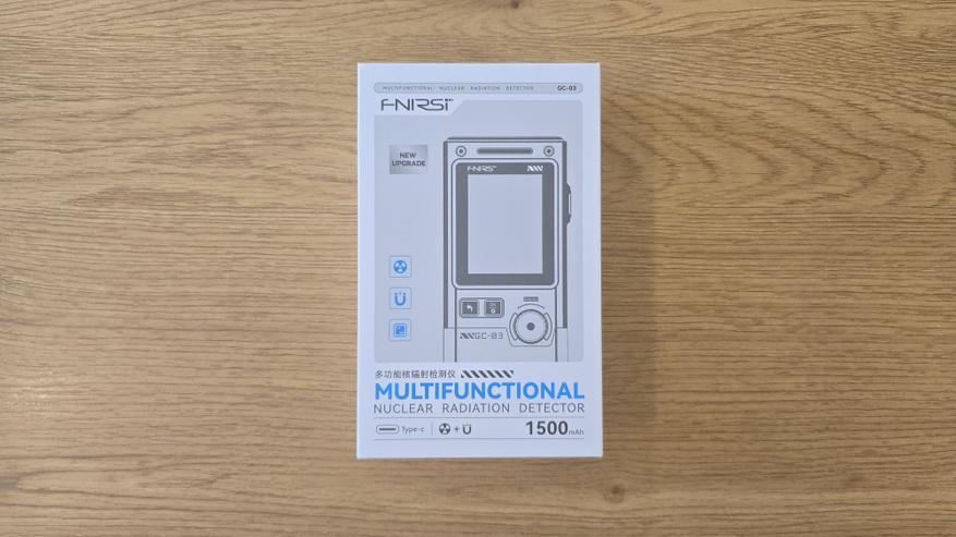 Fnirsi GC-03 поставляется в картонной коробке выполненной в светлых тонах на которой есть изображение самого устройства и его обозначением. Крышка фиксируется на магнитах, внутри предусмотрен формованный ложемент для надежного размещения дозиметра и аксессуаров. На внутренней стороне крышки напечатаны краткие сведения о модели.