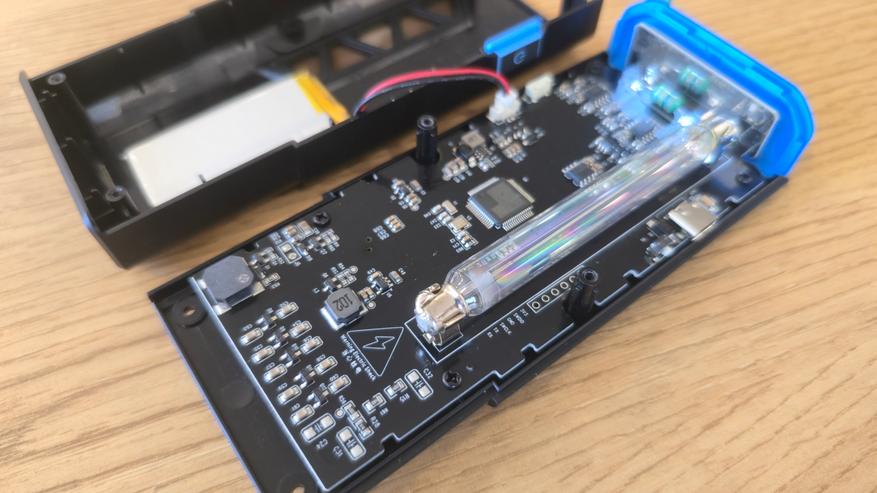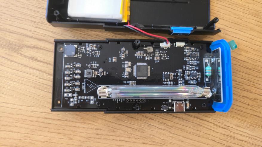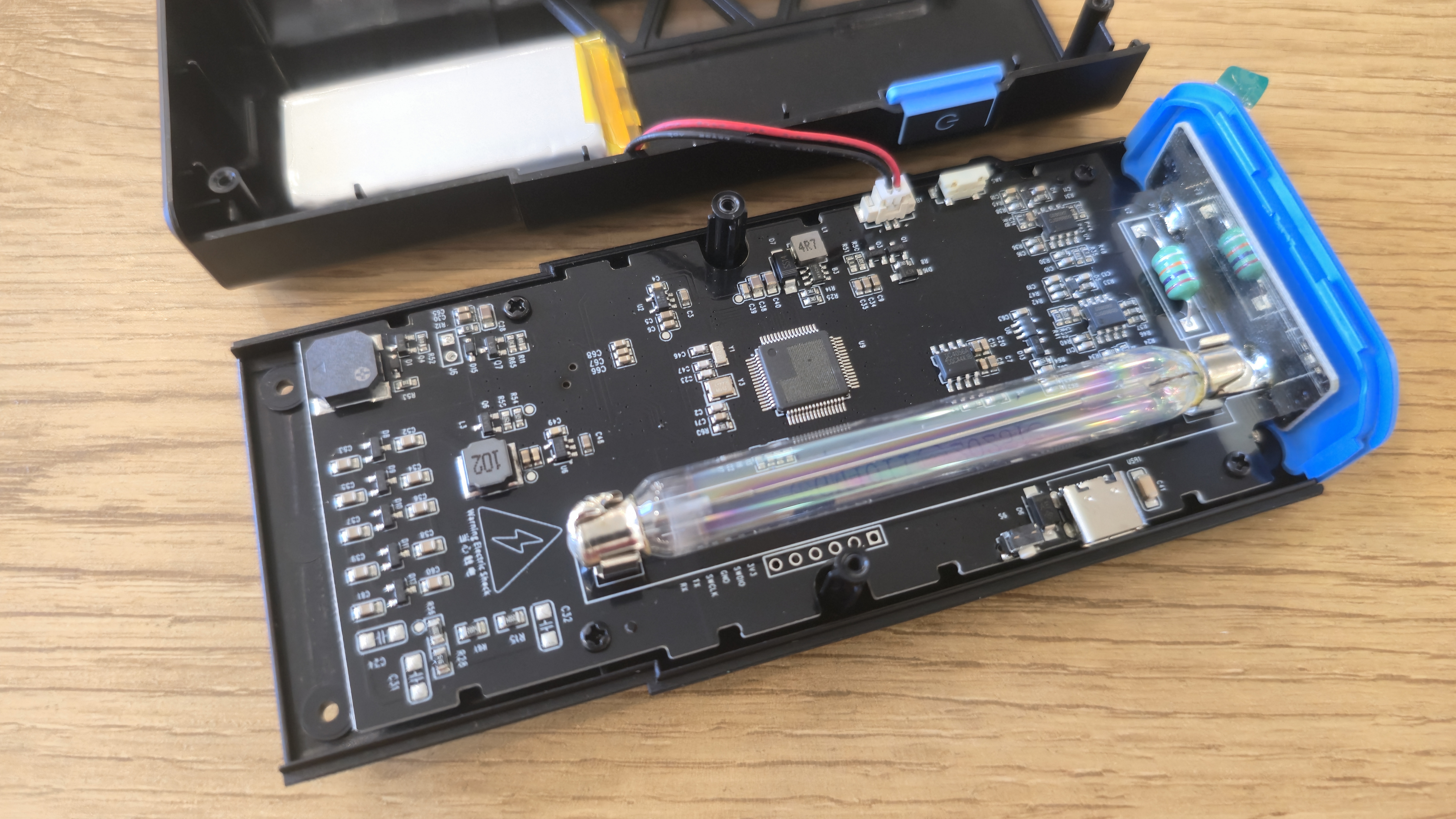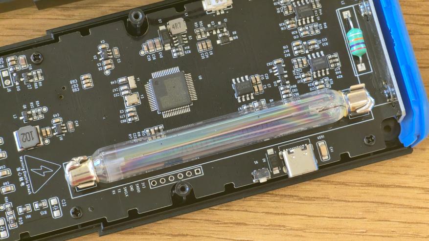 После снятия внешних панелей и декоративных накладок внутри Fnirsi GC-03 открывается простая, но достаточно плотная компоновка элементов на печатной плате. Центральное место на плате занимает стеклянная газоразрядная трубка Гейгера-Мюллера с маркировкой M4011. Она закреплена в держателях и припаяна к контактам, что исключает люфт во время транспортировки. Вдоль нее видны несколько резисторов и элементов высоковольтной обвязки, рядом на плате есть предупреждающая маркировка о высоком напряжении.