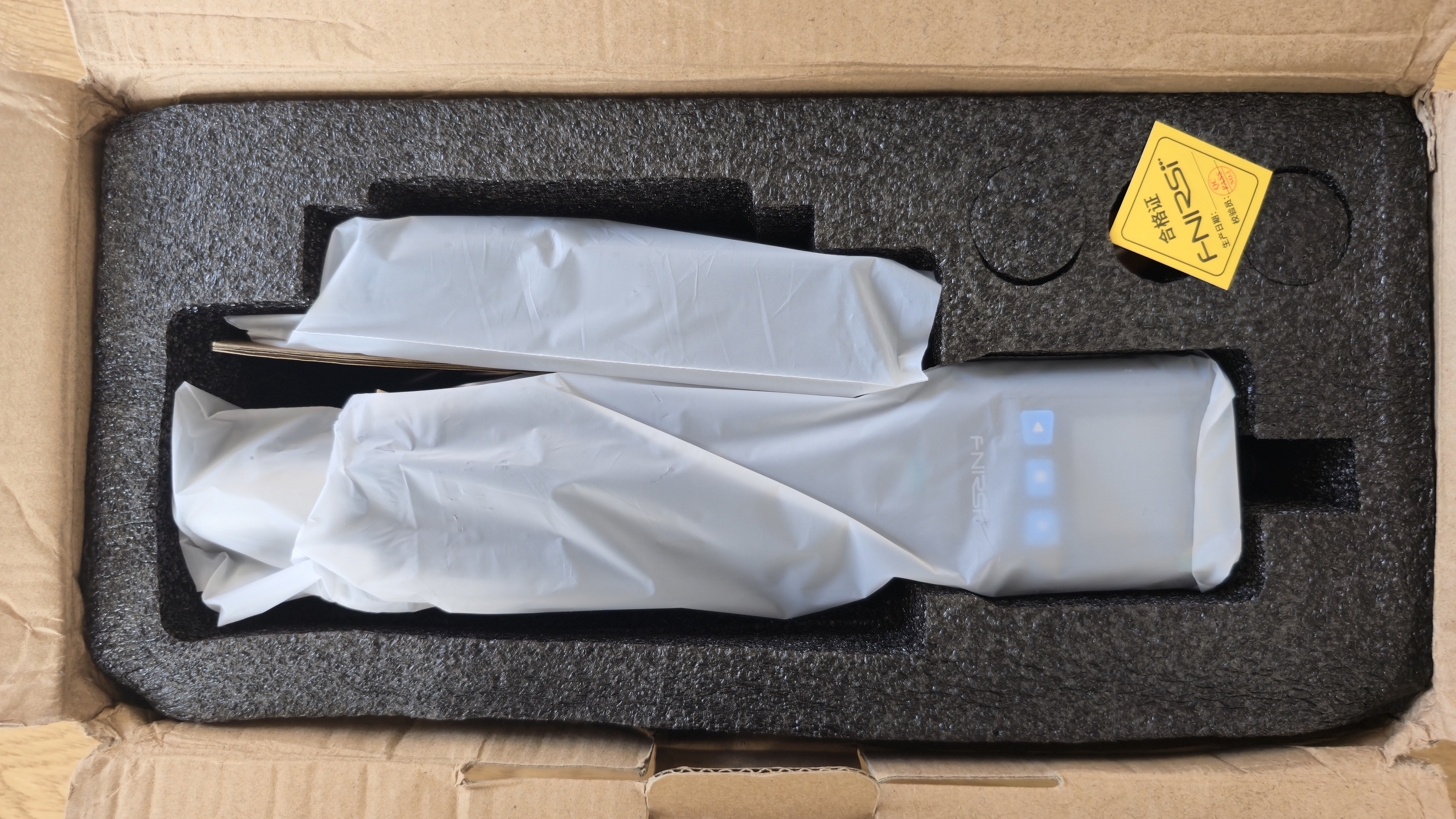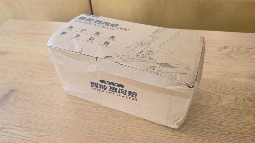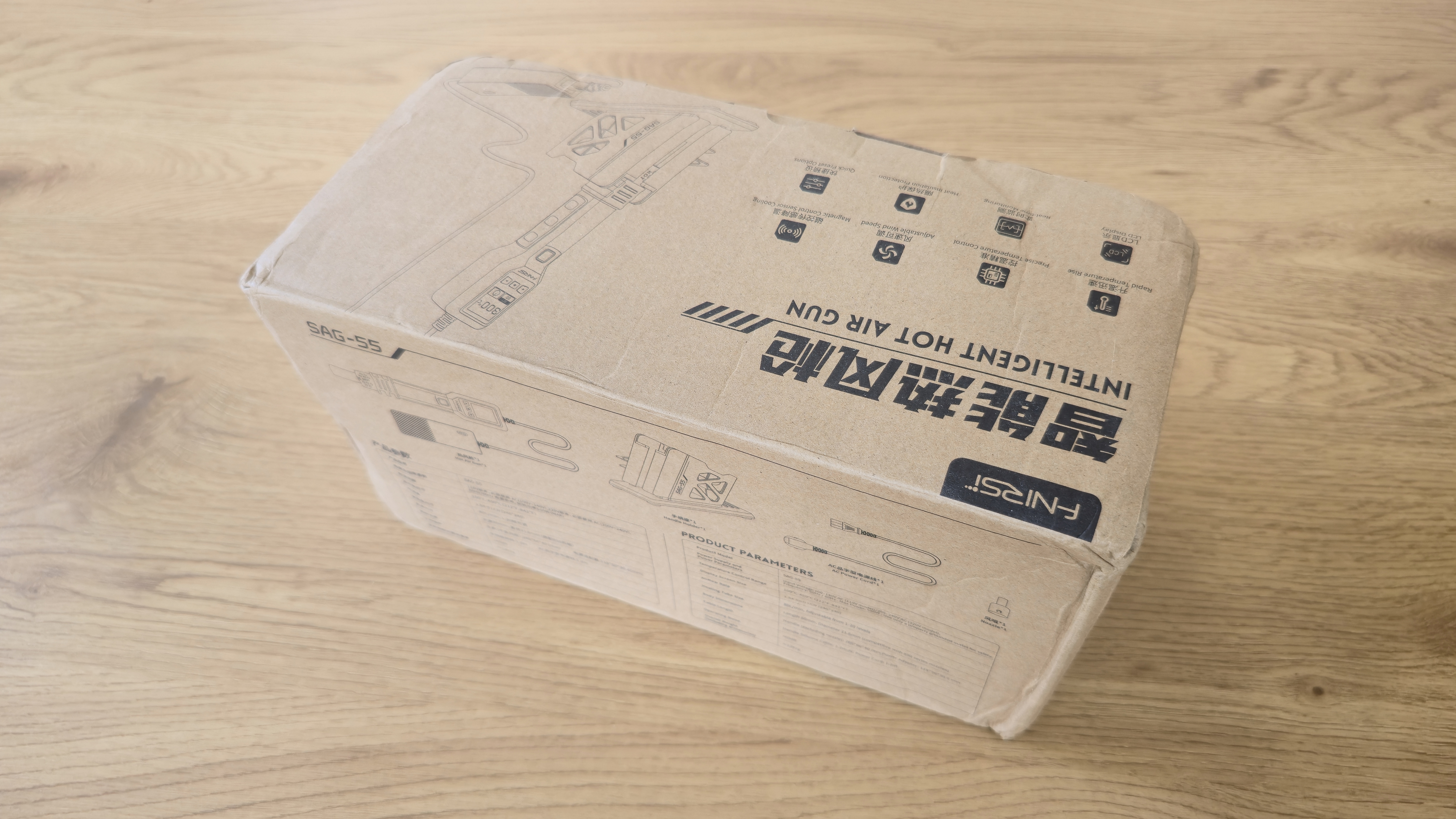 Fnirsi SAG-55 поставляется в коробке из переработанного картона. На передней стороне нанесено изображение самого термофена в комплекте с базовой станцией.