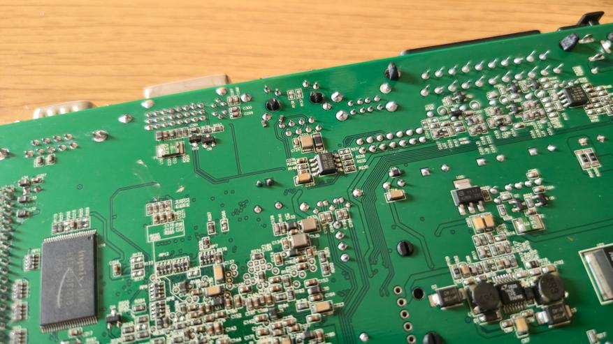 Основные практические испытания я проводил на плате от спутникового ресивера Dreambox 800. Для начала прогрел участок платы на среднем потоке и температуре около 350 °C. После этого микросхема вышла легко, припой расплавился равномерно, а текстолит не пострадал. Такой результат важен именно на старых платах, где дорожки могут быть более хрупкими.
