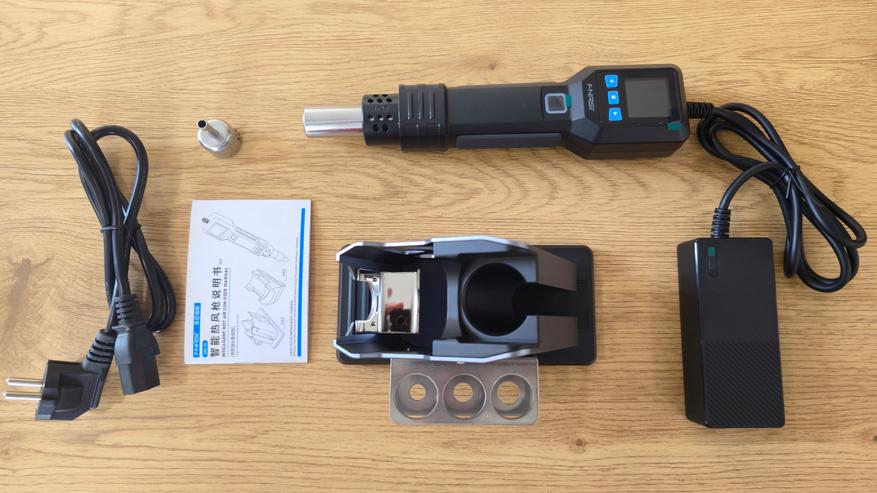 В комплект поставки входят сам термофен SAG-55, адаптер питания и кабель для подключения к сети, руководство пользователя, алюминиевая база с магнитным сенсором и сменные насадки.