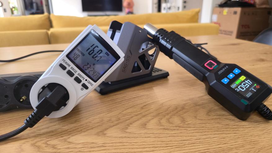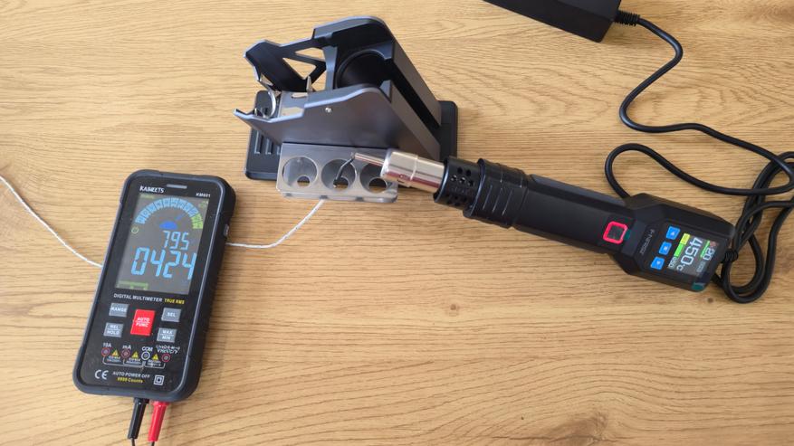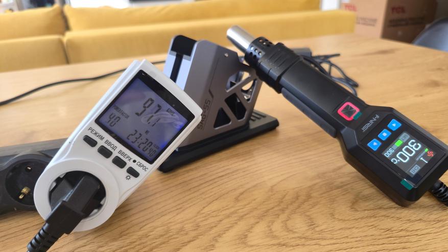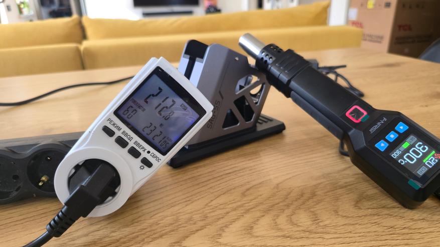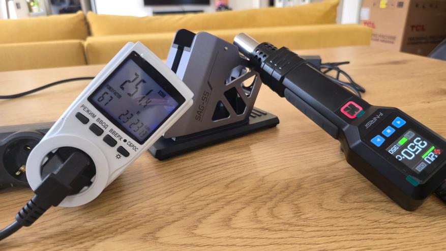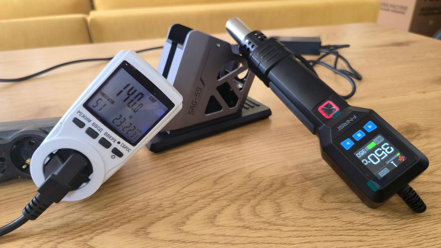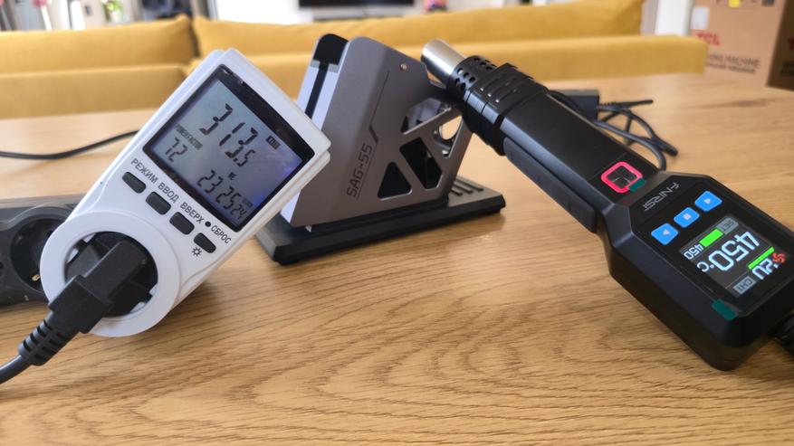 Для проверки реальных характеристик я провел замеры температуры и энергопотребления. В качестве измерителя температуры использовал термопару мультиметра Kaiweers KM601. На дисплее Fnirsi SAG-55 выставлял три стандартные точки: 300, 350 и 450 °C.