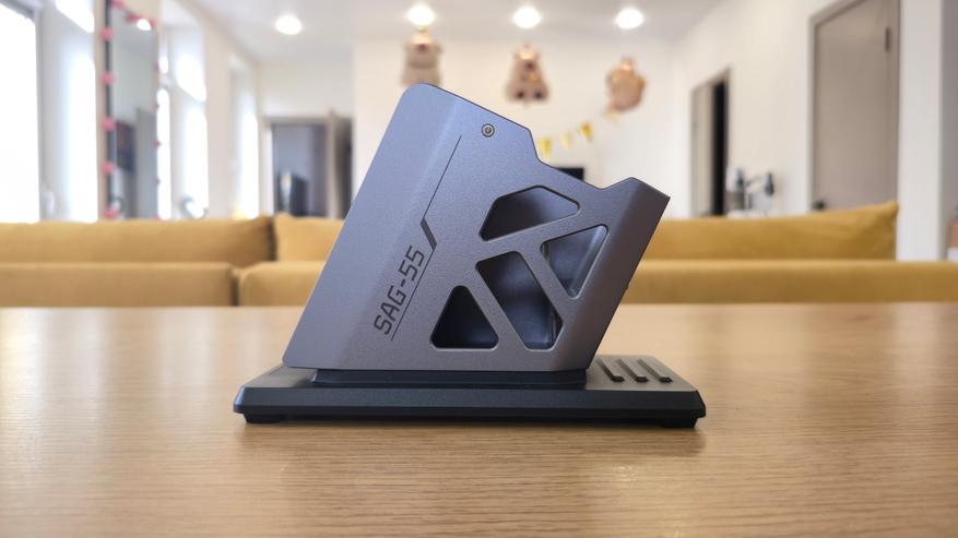 База SAG-55 представляет собой массивный блок с наклонным держателем, в который фен устанавливается передней частью. Основная часть корпуса подставки выполнена из алюминиевого сплава и окрашена в серый цвет. Боковые грани имеют фигурные вырезы, которые облегчают конструкцию и придают ей открытый вид. Внутри держателя проложены термостойкие силиконовые вставки, предотвращающие нагрев корпуса фена и удерживающие его без скольжения. Подставка достаточно тяжелая и устойчивая, поэтому фен можно ставить и снимать одной рукой.