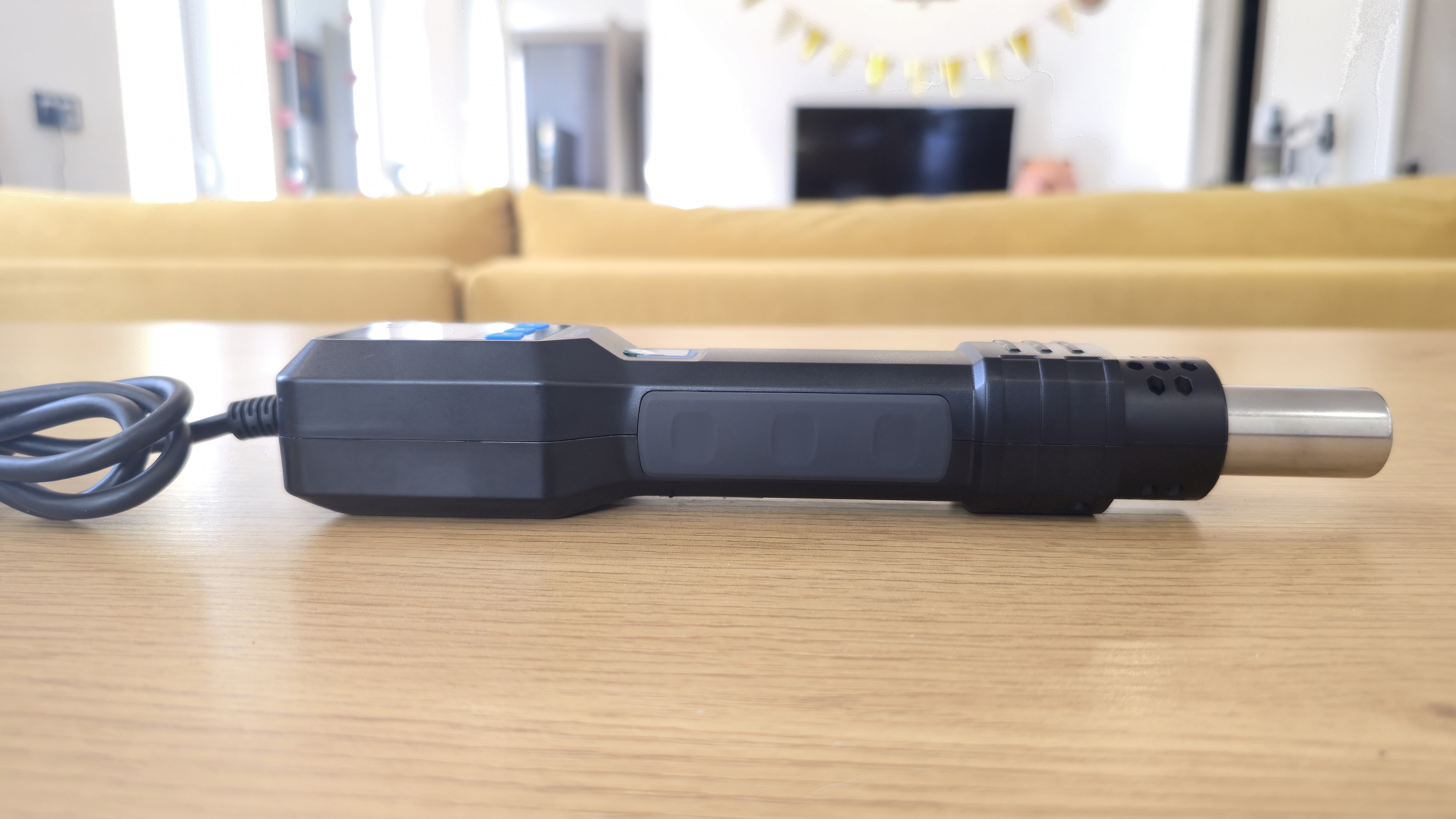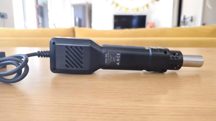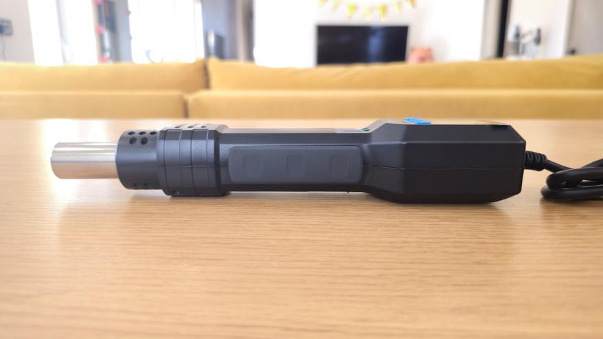 Корпус фена Fnirsi SAG-55 выполнен в вытянутой форме с утолщением в передней части, где расположен нагревательный блок и металлическая трубка для установки насадок. Сама трубка закрыта перфорированным кожухом с вентиляционными отверстиями, которые отводят часть горячего воздуха и одновременно охлаждают узел. По длине фен сопоставим с классическими ручными фенами от паяльных станций, но за счет суженной рукоятки и смещенного центра тяжести он удобно сидит в руке и не перегружает кисть при длительной работе.