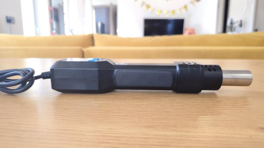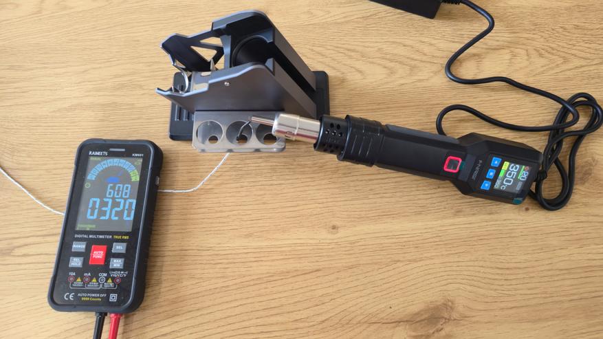 Что касается потока воздуха. Измерить скорость у меня не получилось, но на практике разница между минимальными и максимальными значениями очень заметна. На слабом уровне воздух не сдувает соседние элементы, а на максимуме чувствуется приличное давление, достаточное для прогрева массивных деталей. В общем, на мой взгляд, диапазон регулировки подобран удачно: есть запас и для деликатных задач, и для грубых.