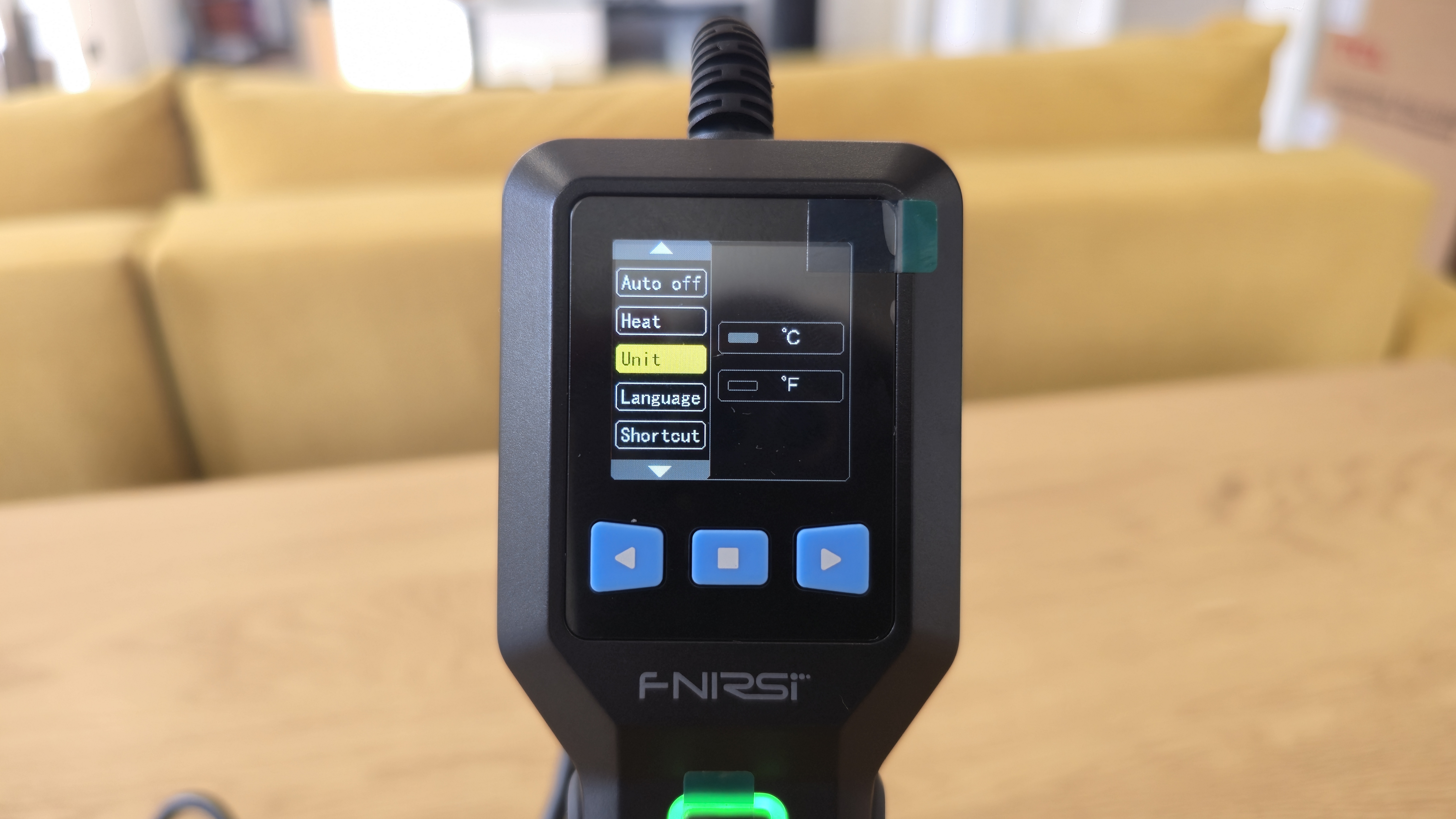 Верхняя часть корпуса отведена под блок с дисплеем. Это цветной экран диагональю 1.54 дюйма, на котором отображаются текущая и заданная температура, скорость потока воздуха и номер выбранного пресета. Интерфейс сделан в цвете, ключевые режимы и показатели выделены разными оттенками, что облегчает восприятие. Под дисплеем расположены три управляющие кнопки с треугольными пиктограммами: левая регулирует уменьшение параметров, правая отвечает за увеличение, а центральная используется для подтверждения и вызова меню. Чуть ниже размещена квадратная кнопка с подсветкой. Ее цвет меняется в зависимости от состояния: при нагреве светится красным, при охлаждении — синим, а в режиме ожидания — зеленым.