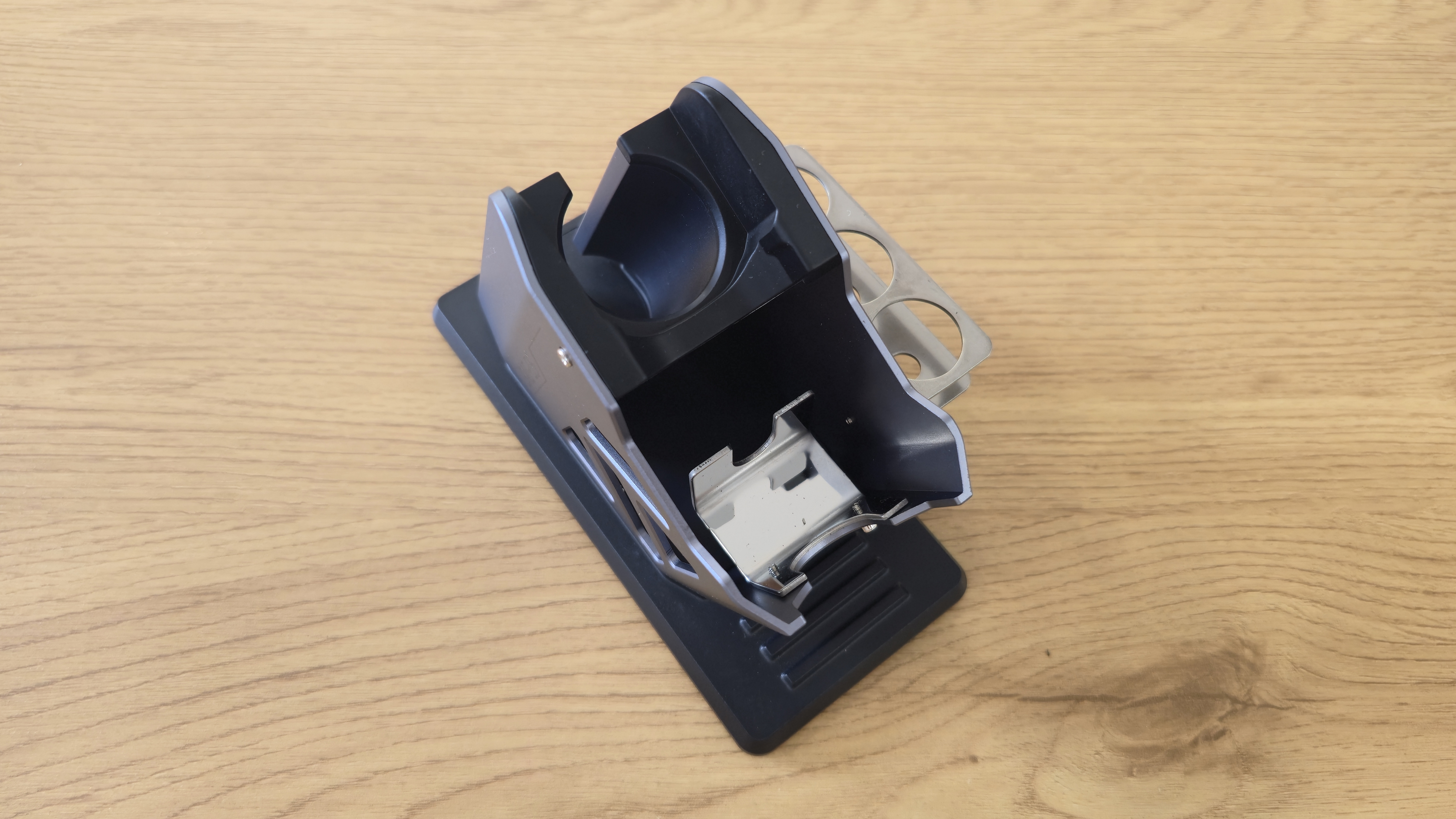 Подставка снабжена магнитным сенсором. Как только фен установлен на место, он автоматически переходит в режим ожидания: температура падает примерно до 80 °C и удерживается на этом уровне. Это позволяет безопасно отложить инструмент, не дожидаясь полного охлаждения. В меню можно выбрать, будет ли фен запускаться автоматически при снятии с базы или потребует нажатия кнопки. Дополнительно есть ускоренное охлаждение, при котором вентилятор выходит на повышенные обороты и быстрее сбрасывает температуру.