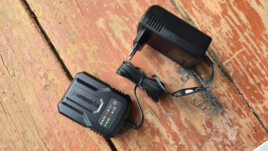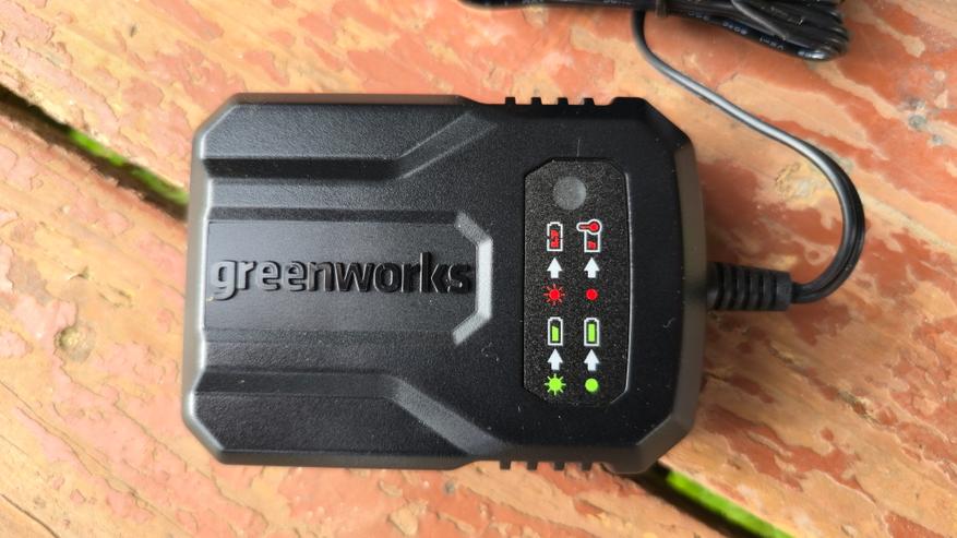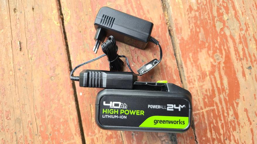 Питание осуществляется от литий-ионных аккумуляторов Greenworks 24V. Они полностью совместимы с другими устройствами этой серии, поэтому можно использовать один и тот же комплект батарей и зарядных устройств для всего инструмента этой платформы. В инструкции отдельно указано, что эксплуатация допускается при температуре от 0 до 45 градусов, а зарядка — в диапазоне от 4 до 40. Это значит, что устройство можно использовать круглый год, если не хранить его на морозе.