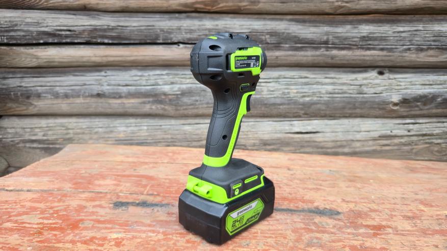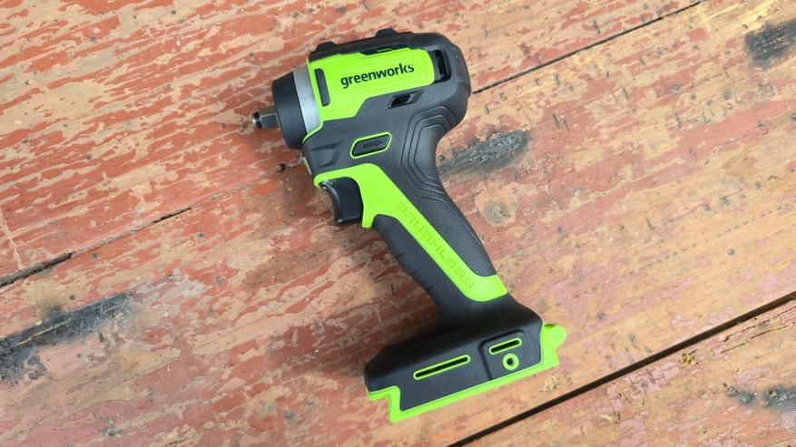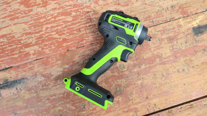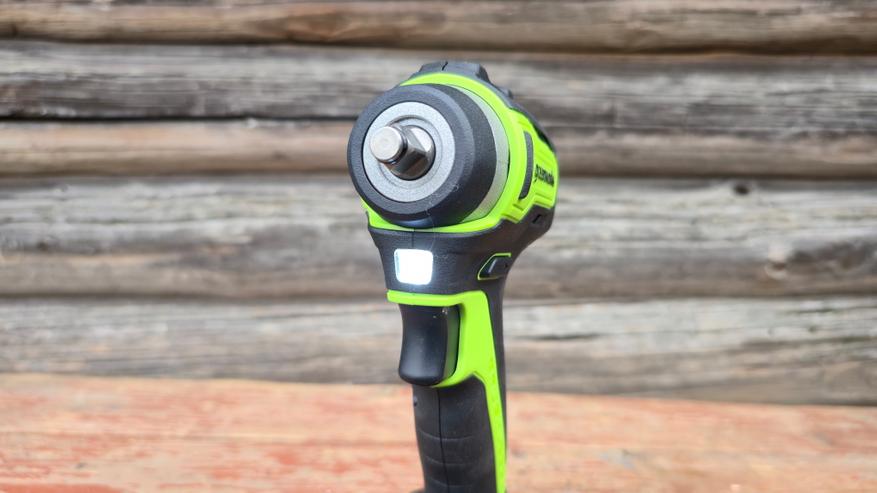 Greenworks G24IW200 выполнен в фирменной для бренда комбинации черного и салатового цветов. Конструкция компактная, сбалансированная по высоте и ширине, без лишних выступов. Если смотреть на инструмент спереди, сразу заметен квадрат шпинделя размером 3/8 дюйма, вокруг которого размещен металлический обод редуктора. Ниже — небольшое светодиодное окно подсветки, направленное под углом вверх, чтобы освещать рабочую область перед инструментом.