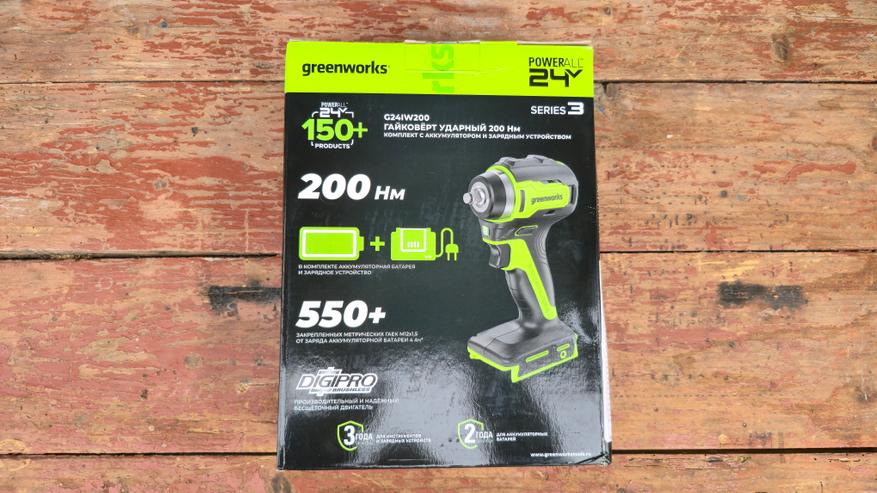 Гайковерт Greenworks G24IW200 поставляется в фирменной коробке черно-зеленого цвета. На лицевой стороне изображен сам инструмент, указаны ключевые характеристики — крутящий момент 200 Нм, питание 24 В и принадлежность к линейке Series 3. Боковые панели оформлены в таком же стиле и содержат информацию о технологии бесщеточного двигателя DigiPro, гарантии и совместимости с системой аккумуляторов Greenworks 24V.