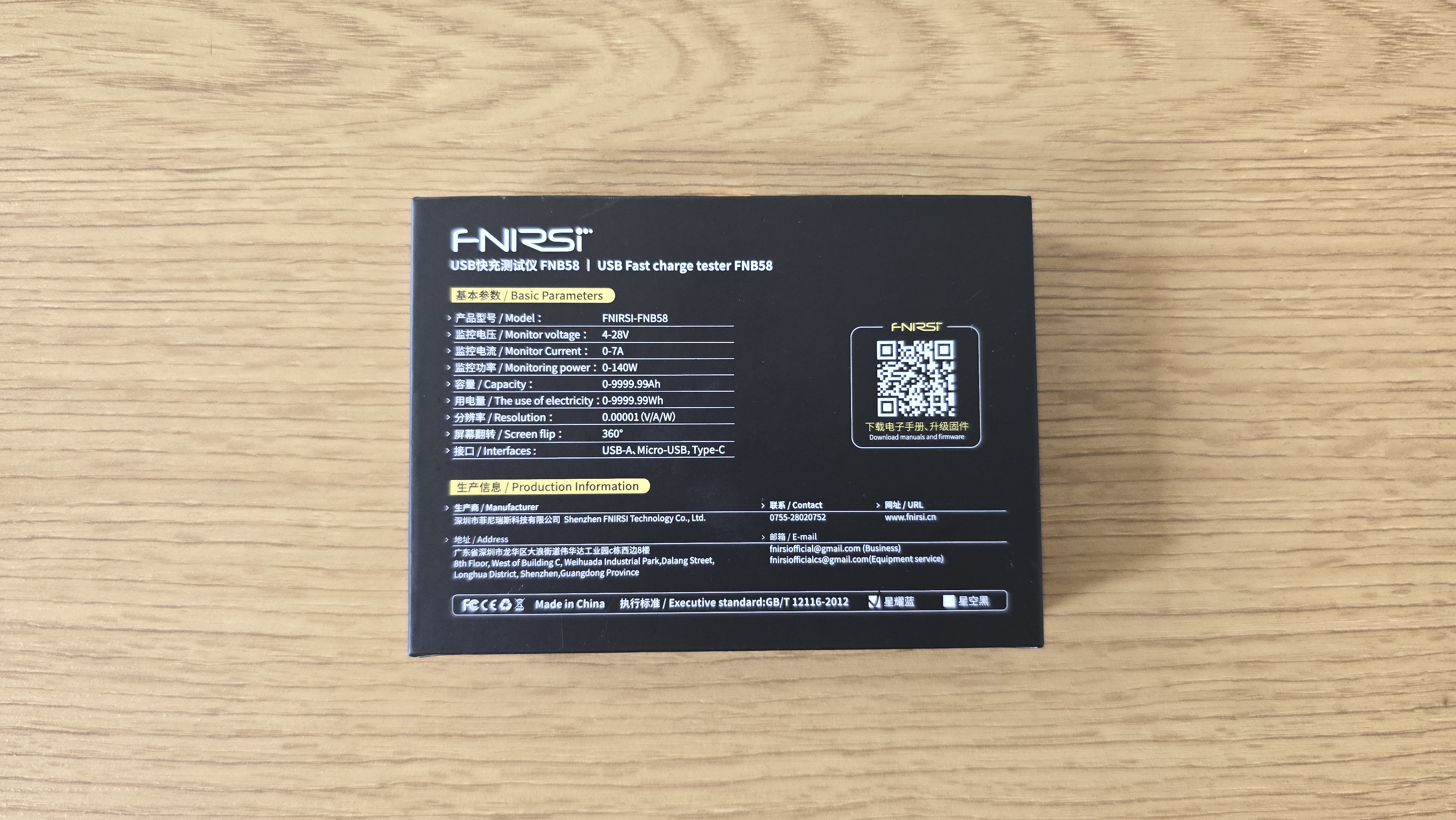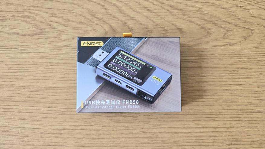 USB-тестер FNIRSI FNB58 поставляется в компактной и аккуратной упаковке, которая предоставляет всю необходимую информацию о продукте. Упаковка выполнена из прочного картона и оформлена в темных тонах с изображением самого тестера на передней стороне. Также здесь указаны модель устройства и его основное предназначение — USB Fast Charge Tester.