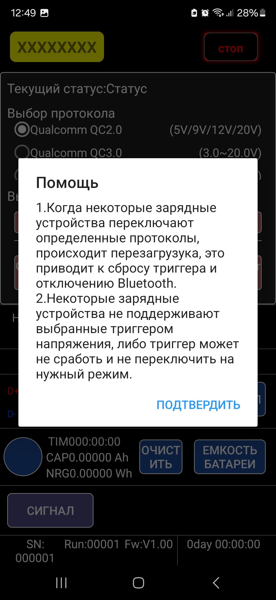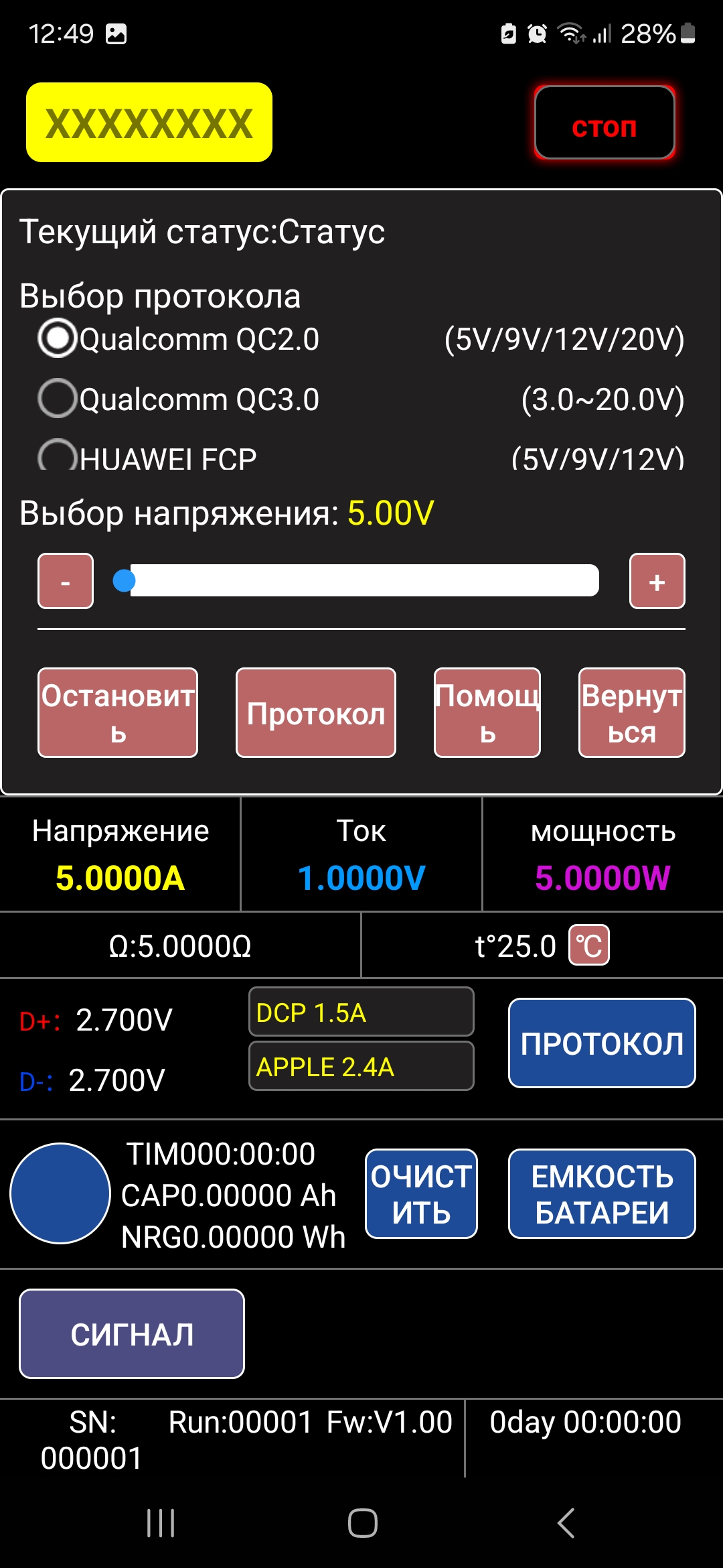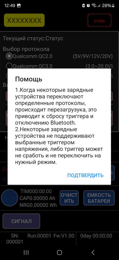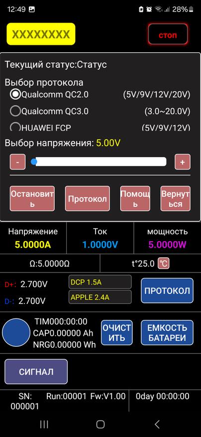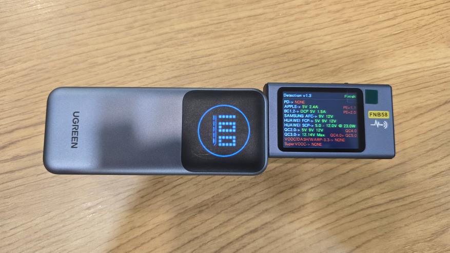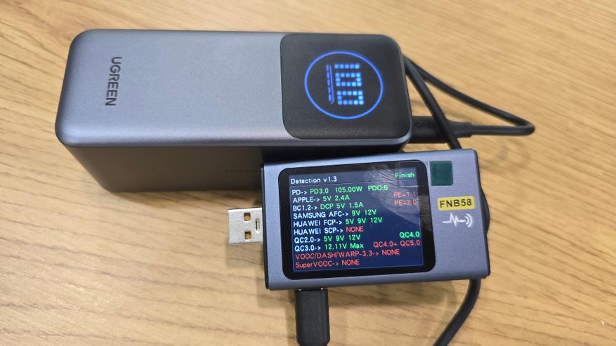 Для проверки поддерживаемых протоколов зарядки PowerBank я использовал специализированный режим тестирования, доступный в USB-тестере FNIRSI FNB58. Этот режим позволяет определять, какие протоколы быстрой зарядки поддерживает устройство, и проводить их тестирование.