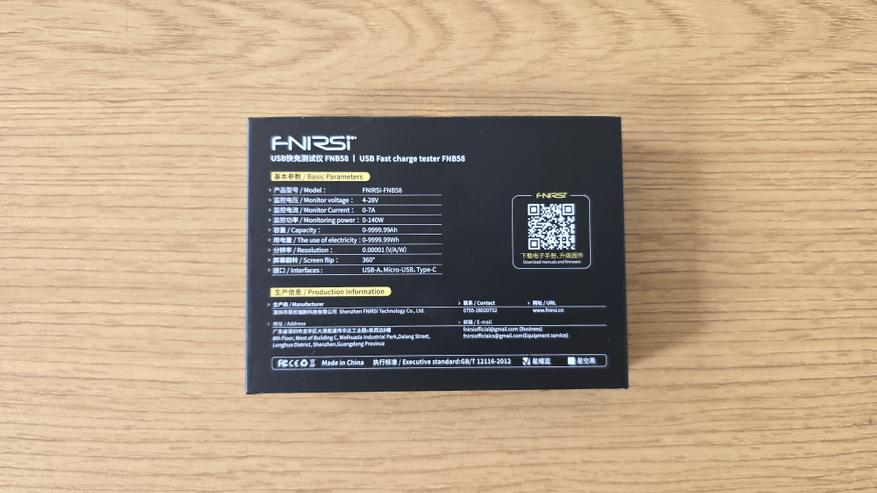 На задней стороне упаковки содержится информация о технических характеристиках устройства. Здесь подробно указаны основные параметры тестера. Также на упаковке размещена контактная информация производителя и QR-код, ведущий на сайт компании FNIRSI.