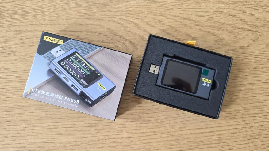 Внутри упаковки устройство аккуратно уложено в ложемент из мягкого материала. Комплект поставки включает исключительно USB-тестер FNIRSI FNB58.