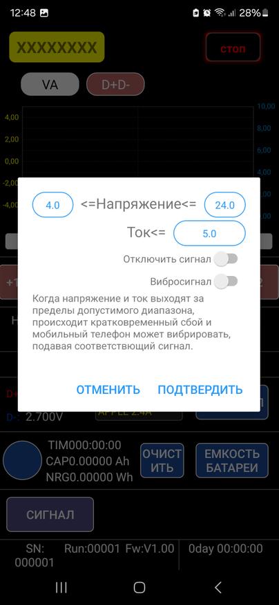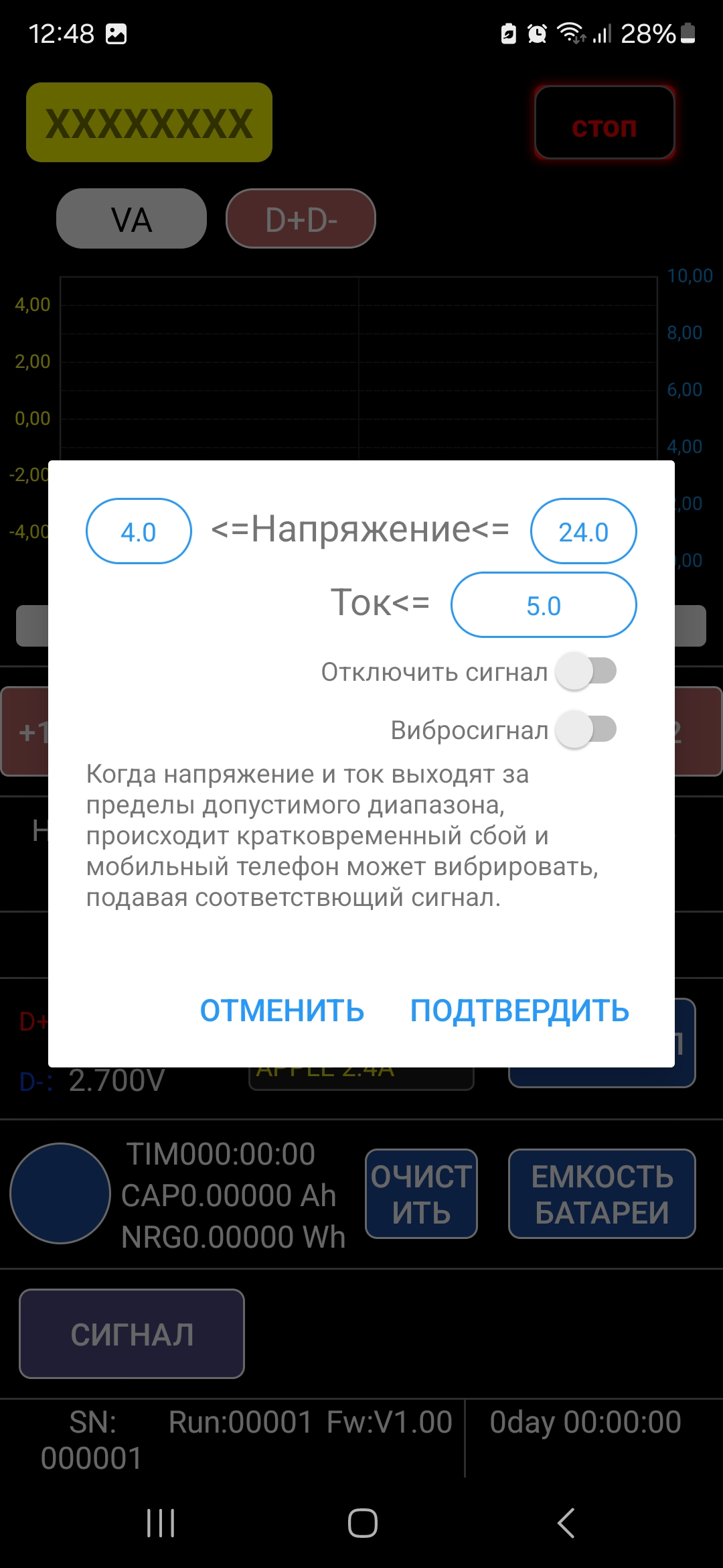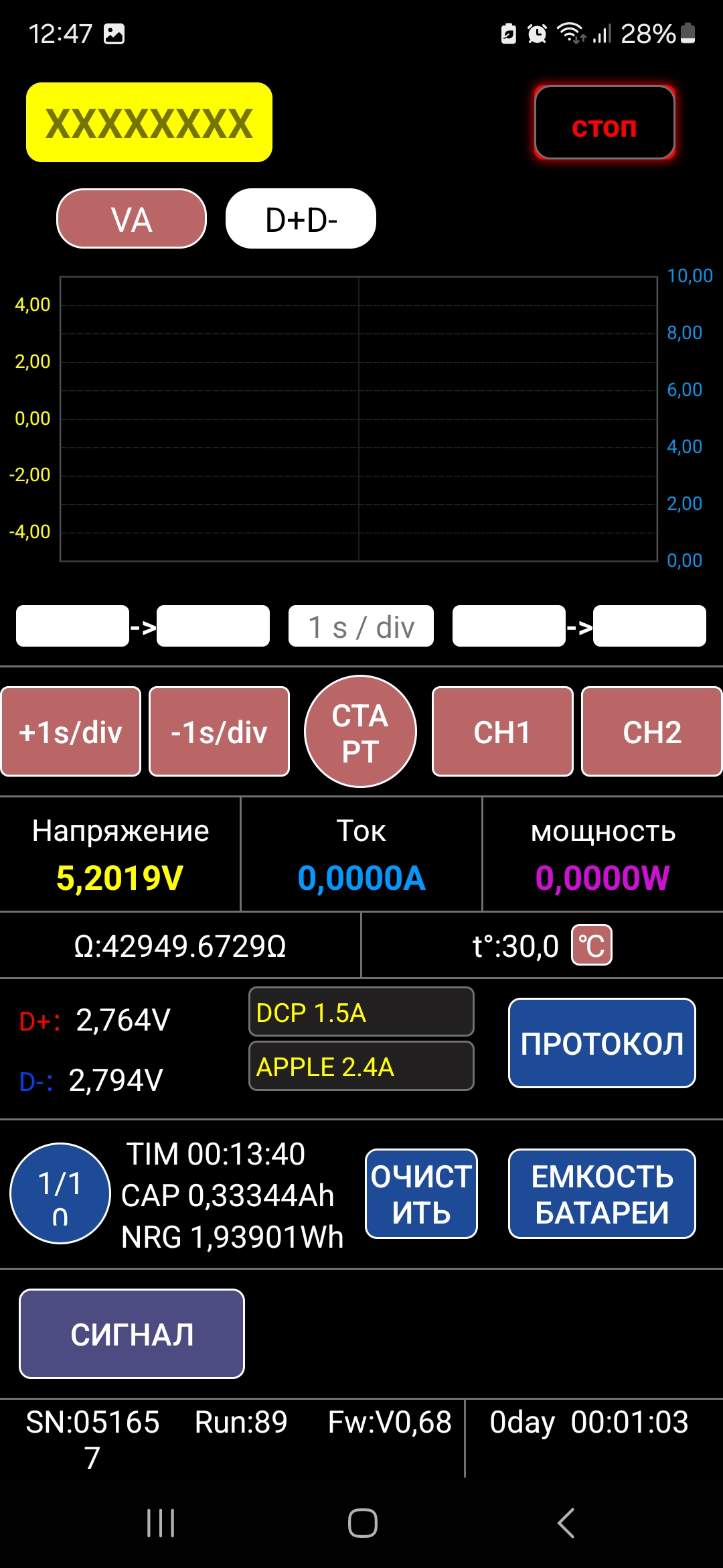 Подключив FNIRSI FNB58 между зарядным устройством и смартфоном, я начал отслеживать параметры зарядки в режиме реального времени. Тестер отображал напряжение, ток и мощность, подаваемые на устройство, что позволило видеть, как изменяются эти параметры в процессе зарядки.