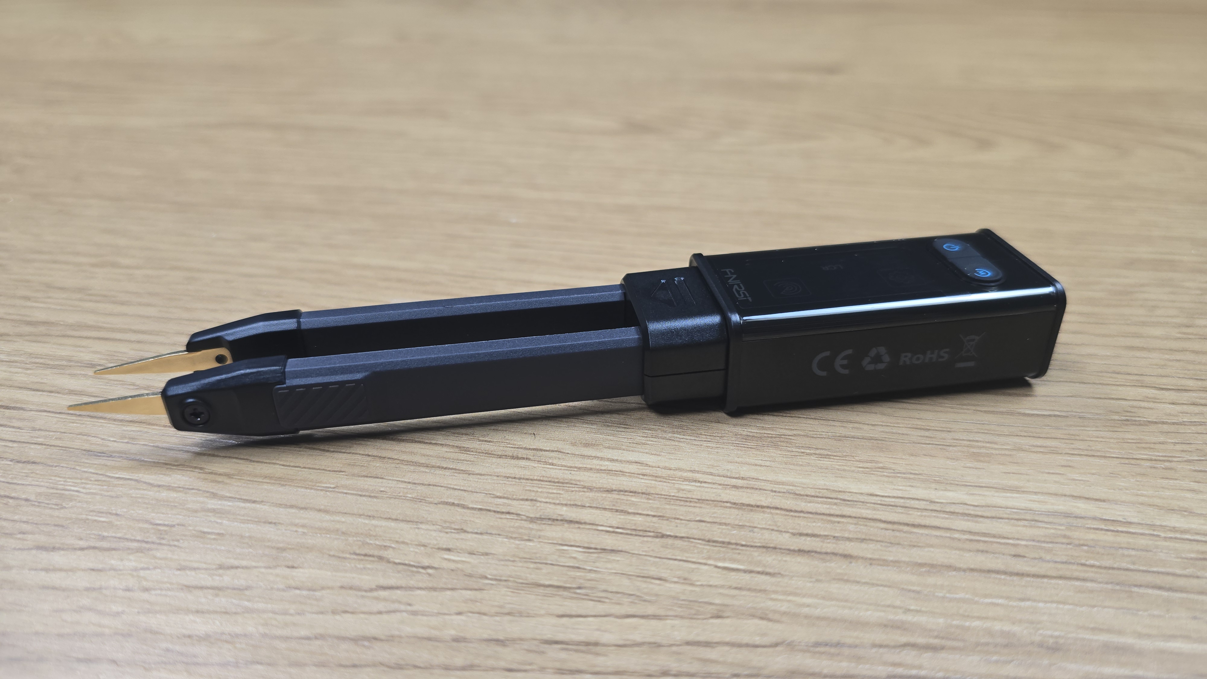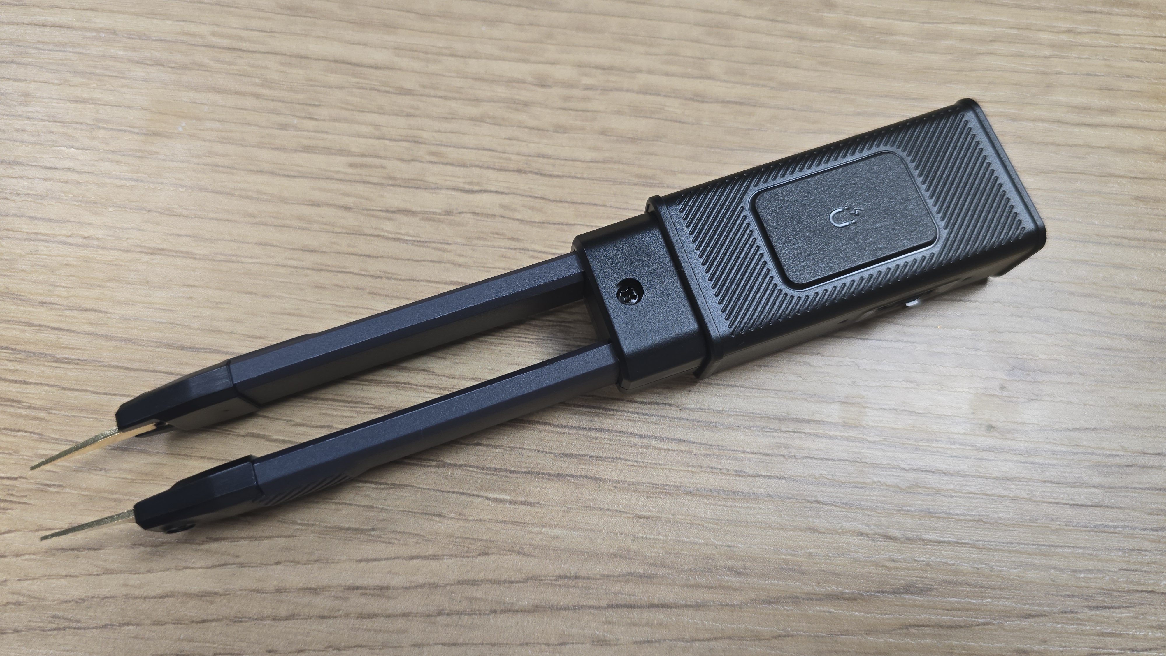 Корпус вытянутый и узкий, без резких граней и изломов. Конструкция визуально разделена на два логических блока. В верхней части находится основной быстросъемный модуль с экраном и элементами управления. Ниже из него выходит измерительный блок, состоящий из двух жестких ножек пинцета со сменными металлическими наконечниками. Соединение измерительного блока с основным корпусом реализовано через порт USB-A, который используется как механический и электрический интерфейс для быстрого подключения и снятия модулей.