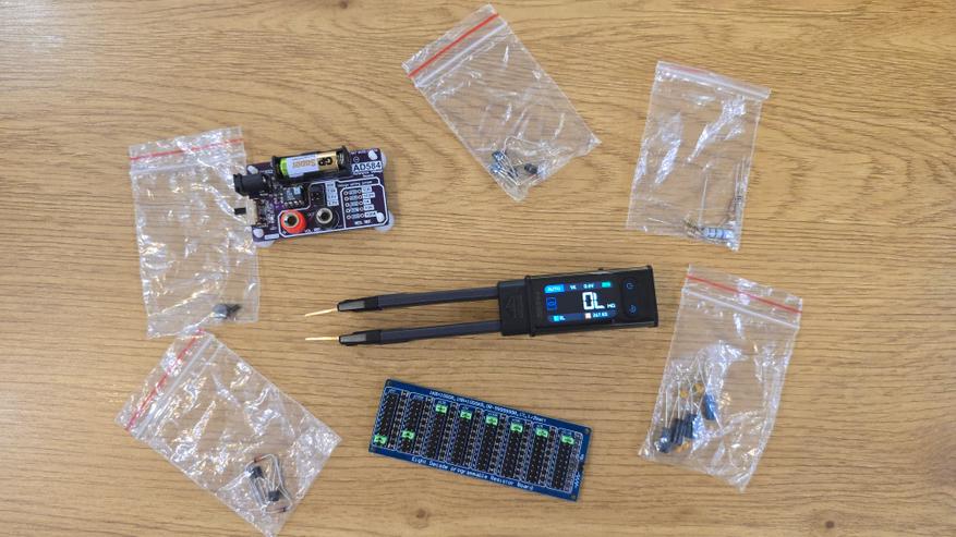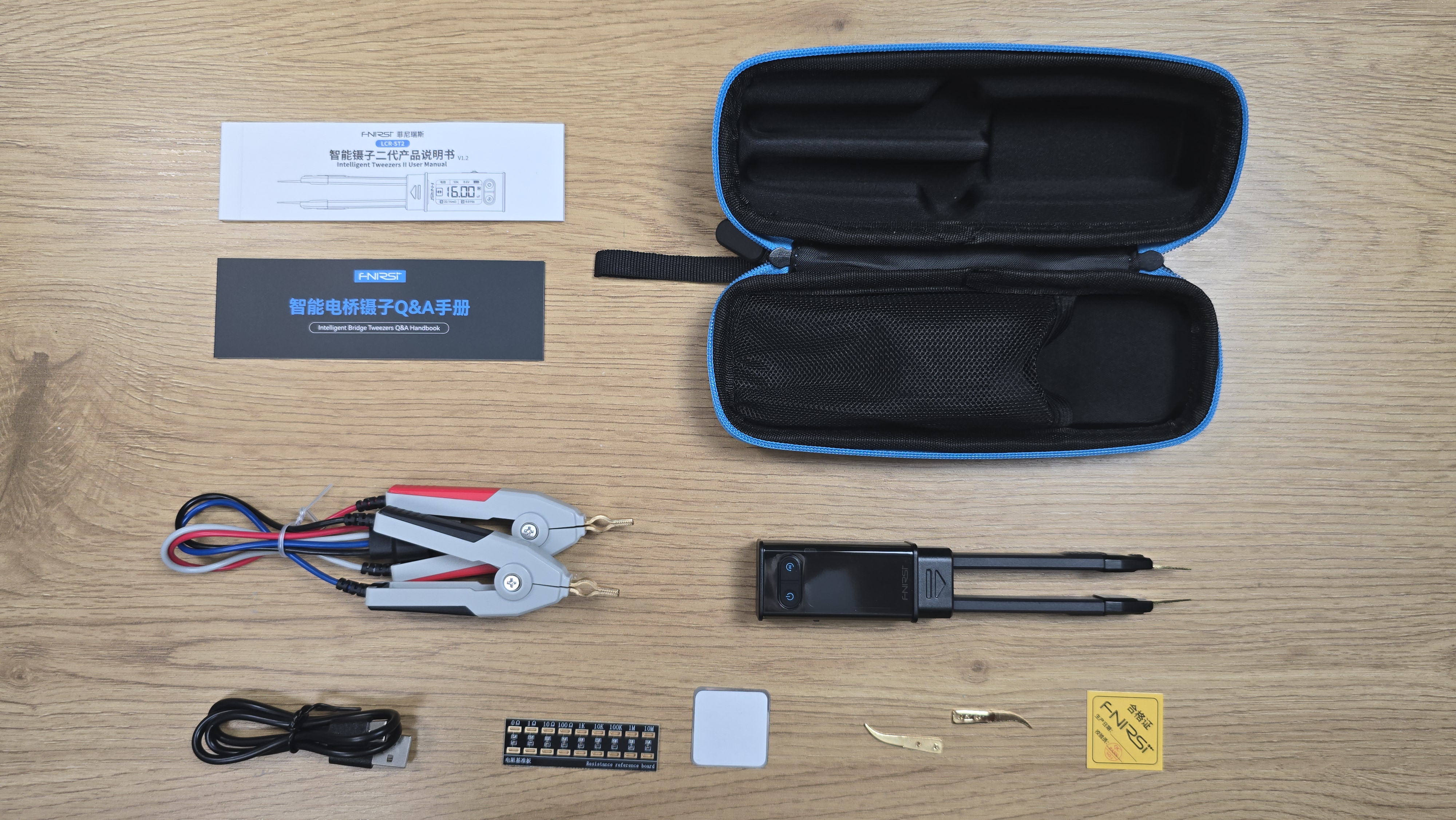 Внутри лежит сам LCR-пинцет, набор сменных наконечников, металлическая калибровочная пластина для процедуры short, кабель USB для зарядки встроенного аккумулятора, мягкий чехол для хранения и переноски. Отдельно добавлены Kelvin-клещи для четырехпроводных измерений и бумажное руководство. Комплект собран практично: все необходимое для начала работы и корректной калибровки предусмотрено сразу.