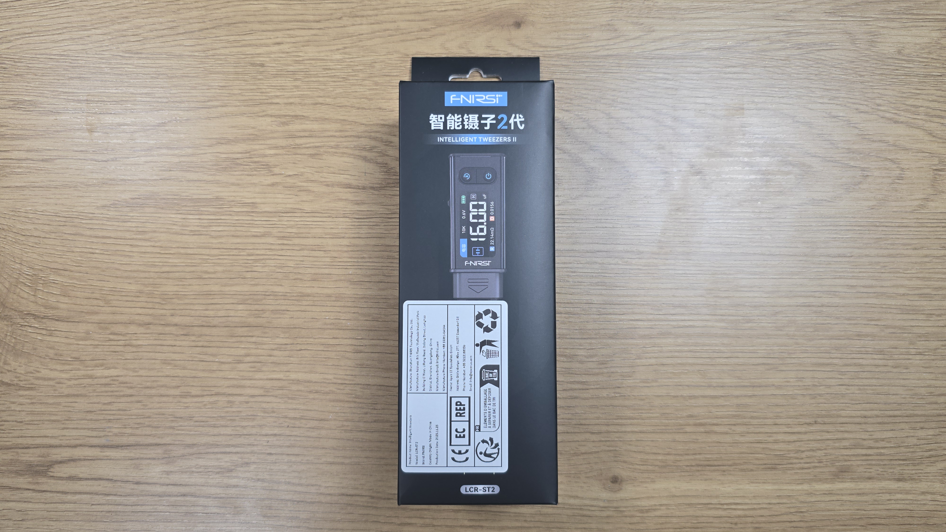 Измерительный пинцет Fnirsi LCR-ST2 упакован в аккуратную коробку из плотного картона. Оформление спокойное: на лицевой стороне напечатано изображение самого прибора, сзади — краткий перечень характеристик и функциональных возможностей.
