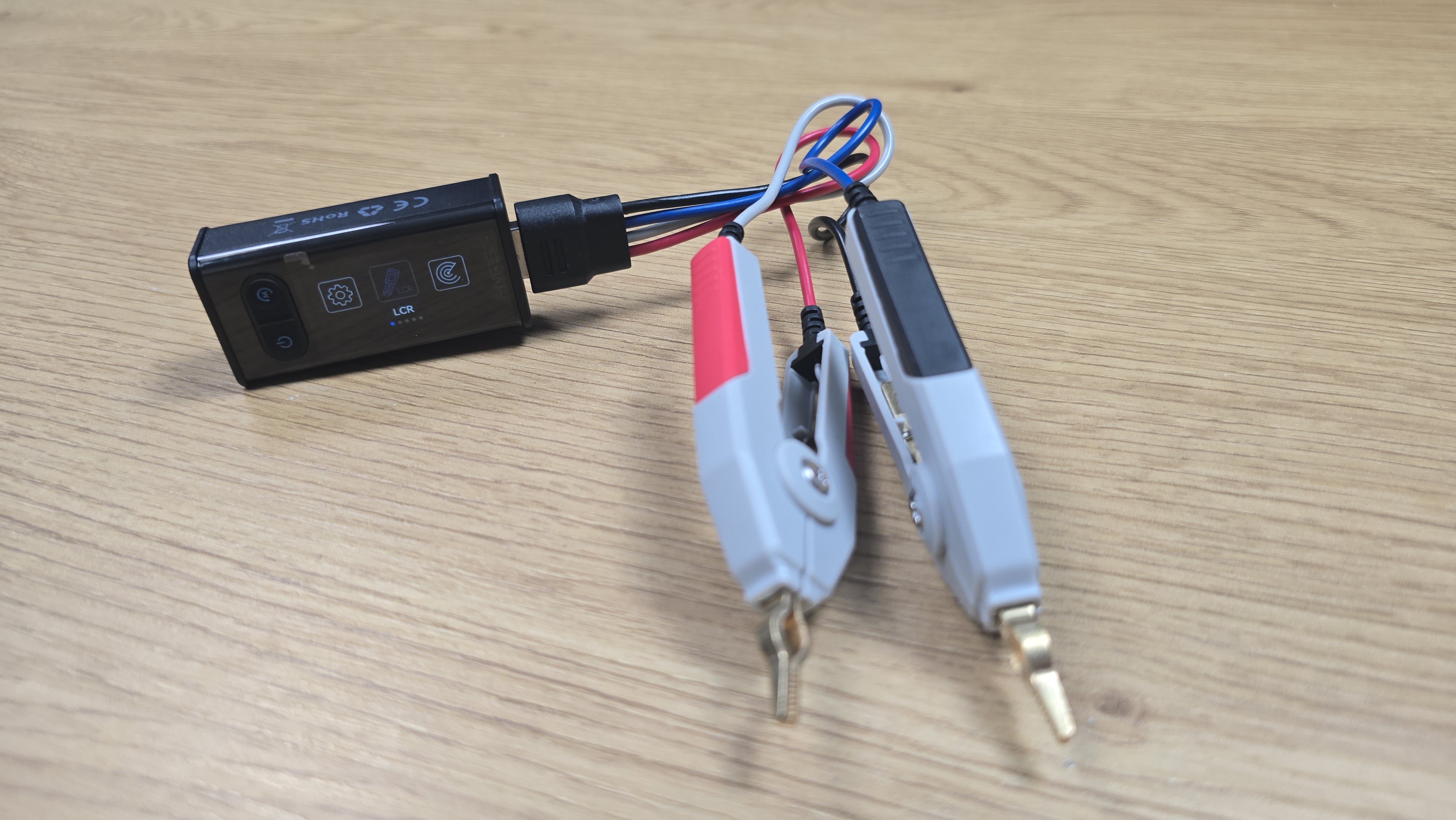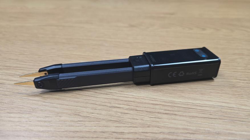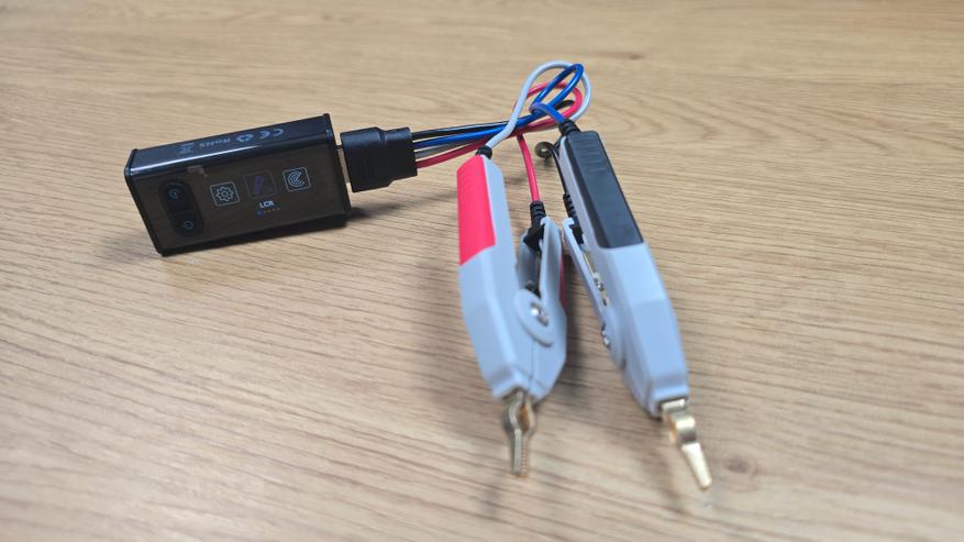 Вместо пинцетного блока может использоваться модуль с Kelvin-клещами, который подключается к основному корпусу через тот же порт USB-A. В этом исполнении измерительная часть представляет собой пару отдельных зажимов, соединенных с корпусом гибкими проводами. Каждый зажим имеет собственные контакты, что реализует четырехпроводную схему подключения и снижает влияние сопротивления проводов и контактов на результат измерений. Клещи рассчитаны на работу с более крупными компонентами и выводными деталями, где пинцет использовать неудобно. Контактные губки металлические, с плоской формой, обеспечивают хороший захват вывода или контактной площадки. Такой вариант расширяет сценарии применения прибора и позволяет переключаться между компактной работой с SMD-элементами на крупные компоненты.