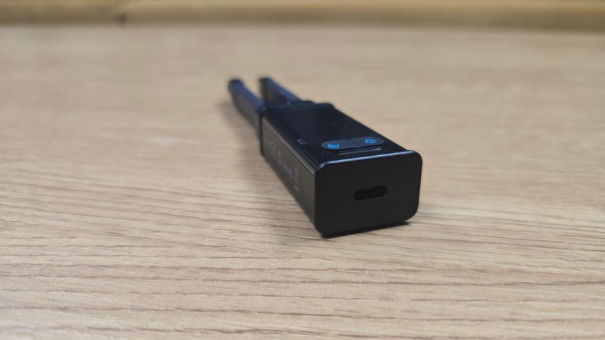 На правом торце корпуса расположен порт USB-C. Он используется для зарядки встроенного аккумулятора, а также для подключения к компьютеру при обновлении прошивки. Разъем утоплен в корпус и расположен по центру торца.