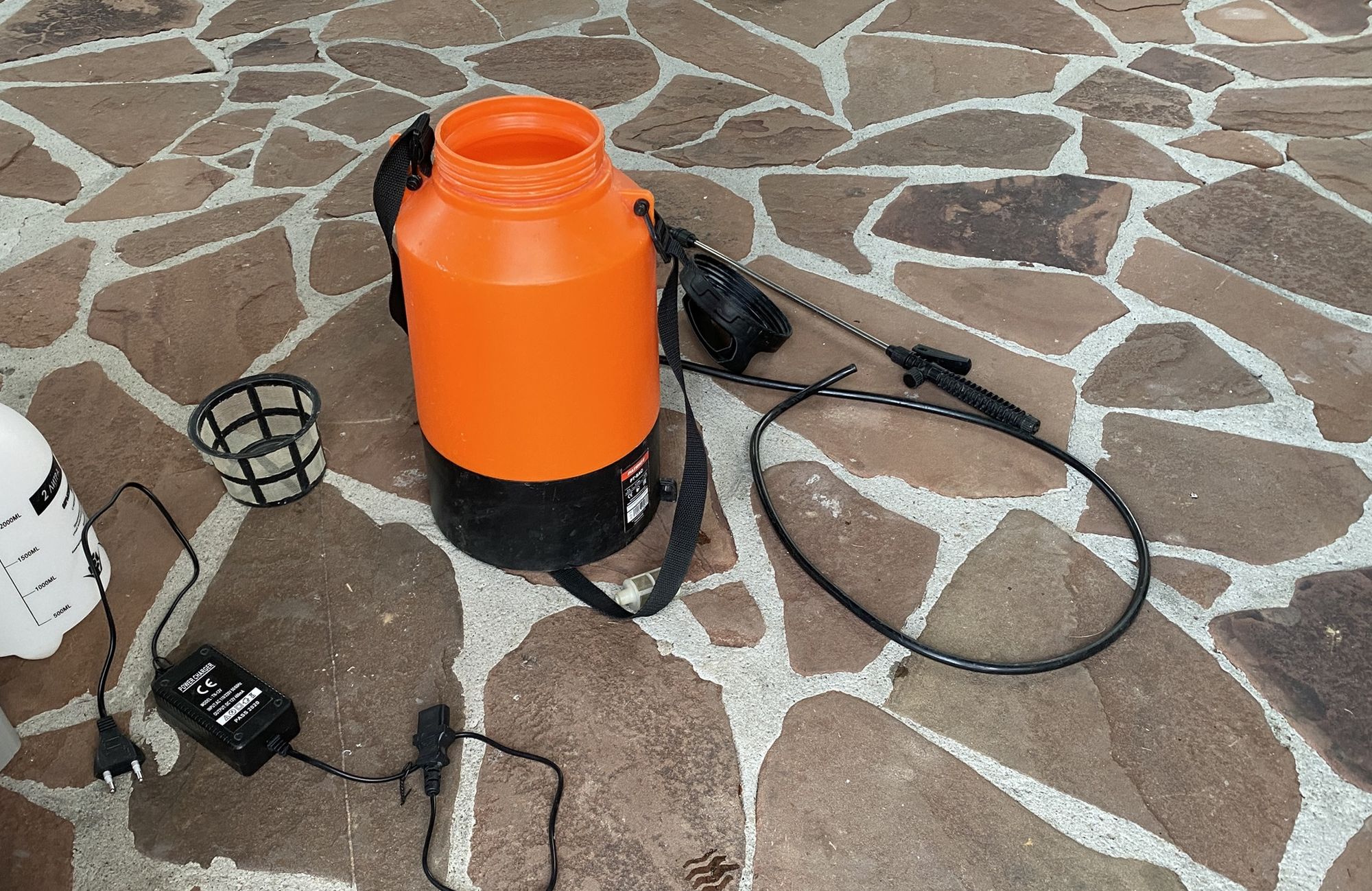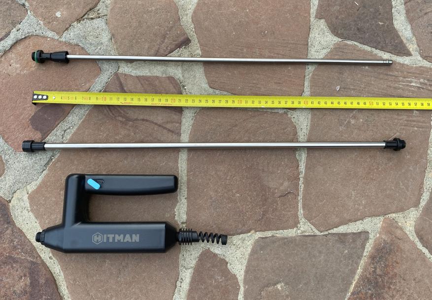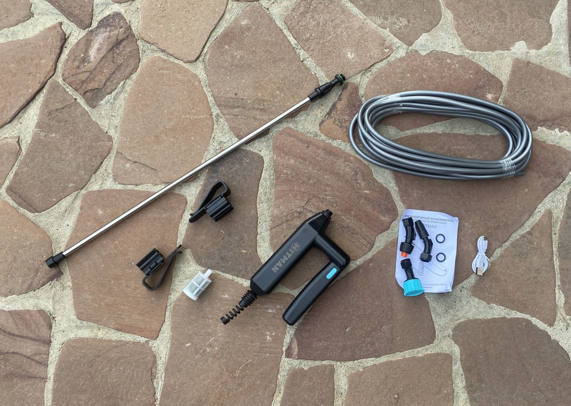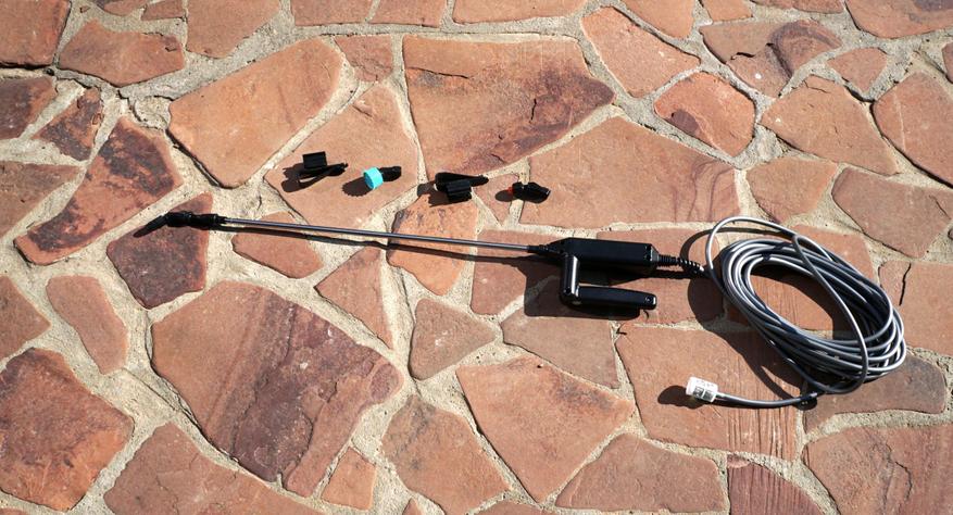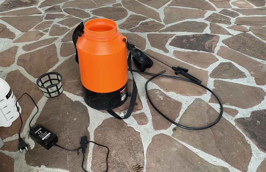 В комплект входят следующие компоненты: сам опрыскиватель, раздвижная штанга, восьмиметровый шланг, три разных форсунки, две уплотнительные прокладки, фильтр с грузом, два фиксатора шланга, короткий зарядный кабель и листочек инструкции.