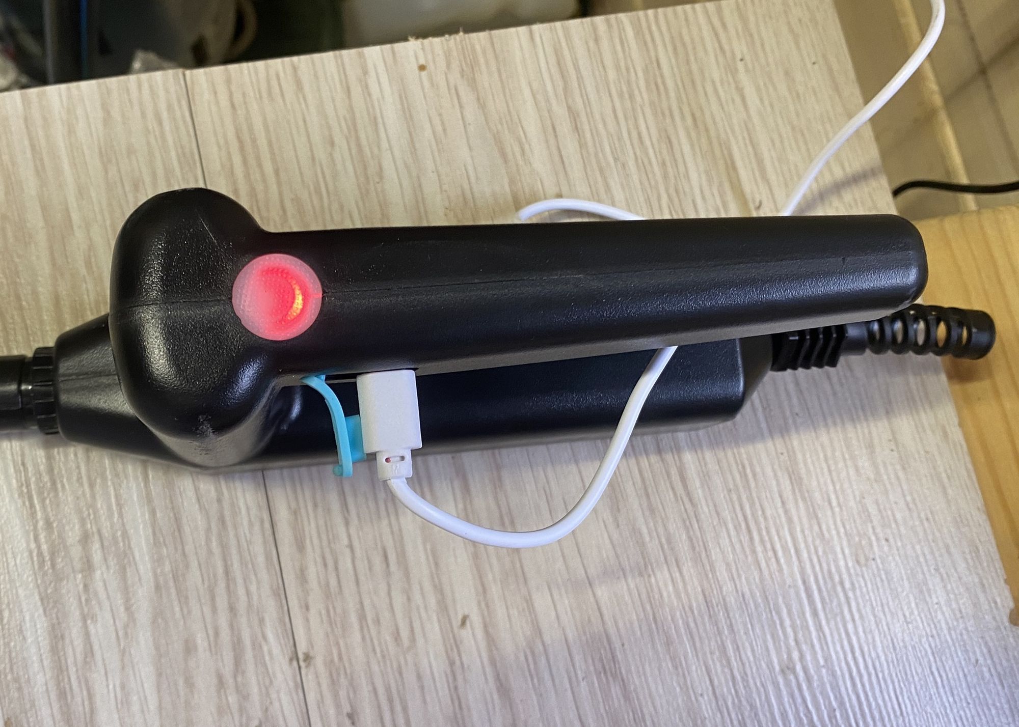 Перед использованием заряжаем опрыскиватель, зарядка идет достаточно долго — около 4 часов. В процессе заряки горит красный светодиод под кнопкой, после того как батарея полностью заряжена он гаснет.