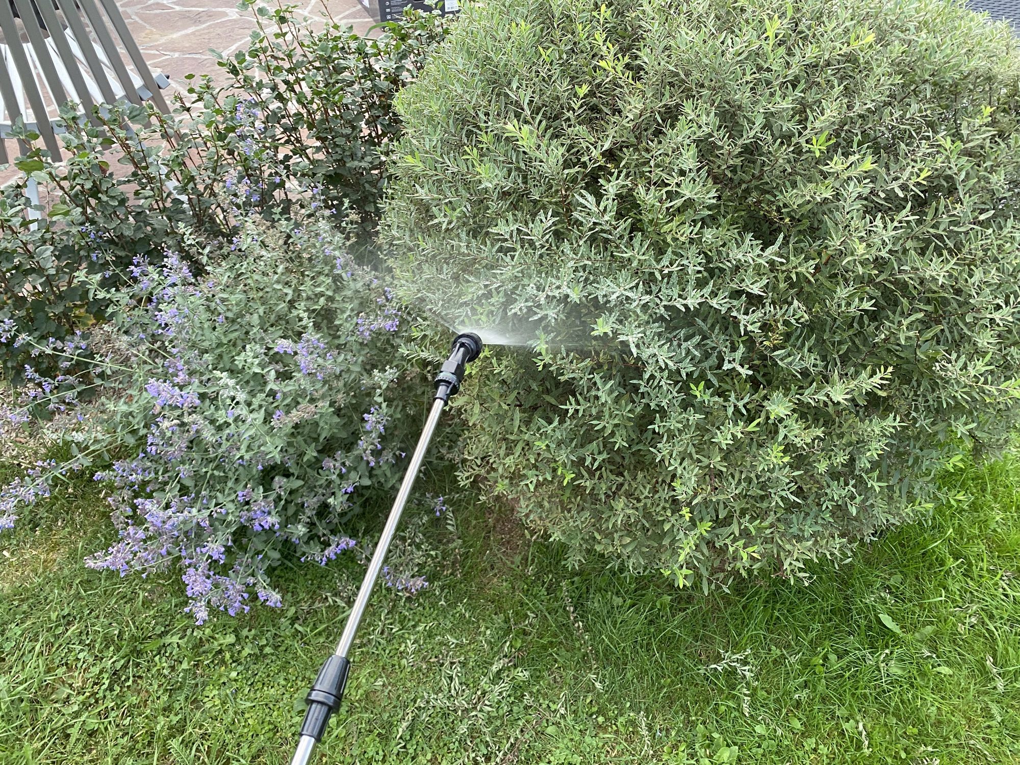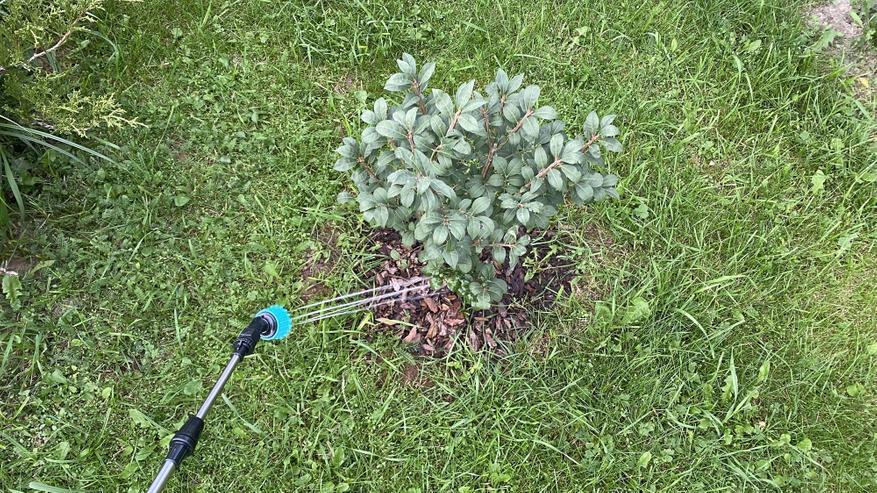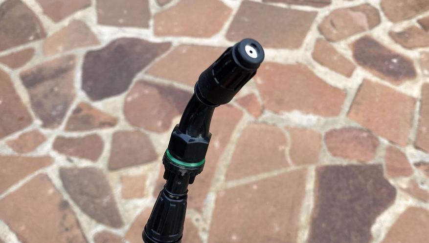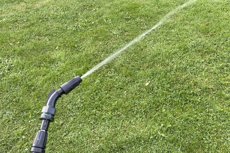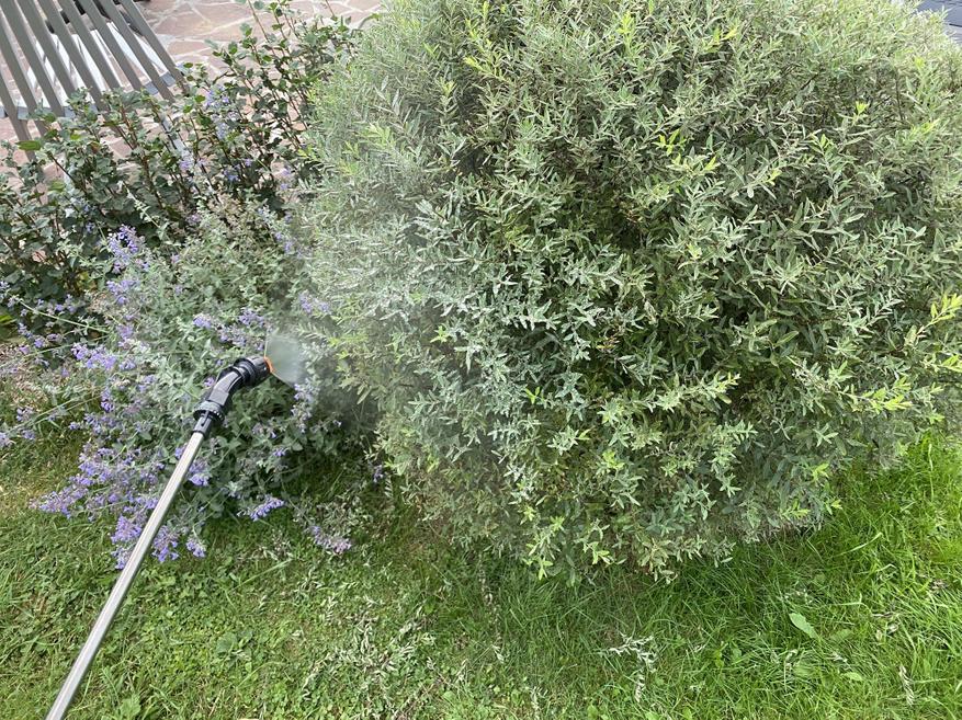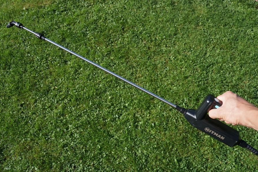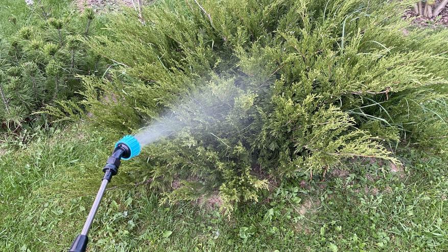 Процесс опрыскивания обзорным аппаратом идет стабильно — насос работает ровно и тихо, равномерно прокачивая жидкость, без рывков и задумчивости (как было на моем прошлом опрыскивателе). Длины штанги в 110 см + длина руки хватает для кустарников, туй, небольших деревьев. Плюс к этому, если сделать конус распрыскиваемой жидкости более узким, то он может бить еще примерно на 1 метр.