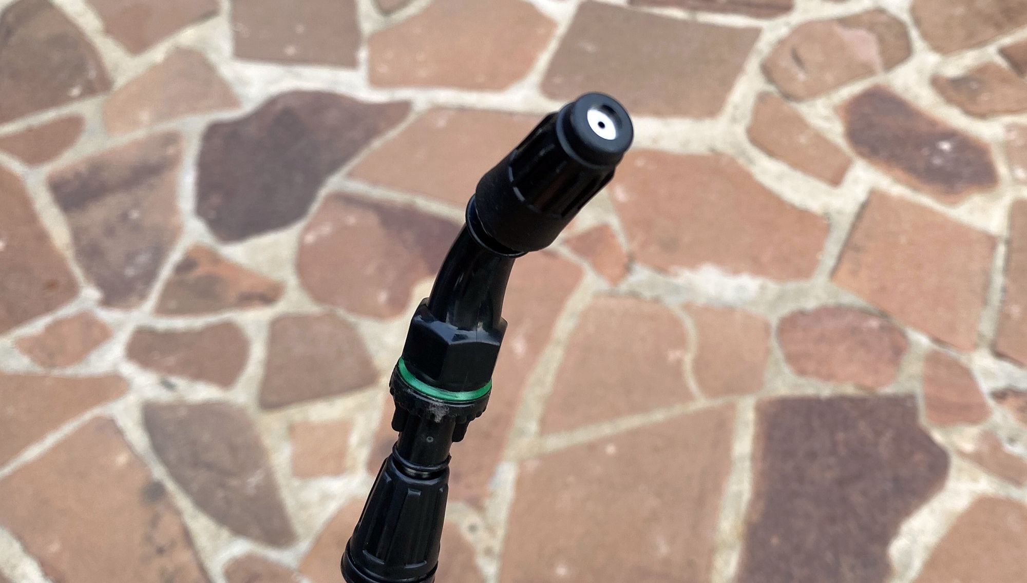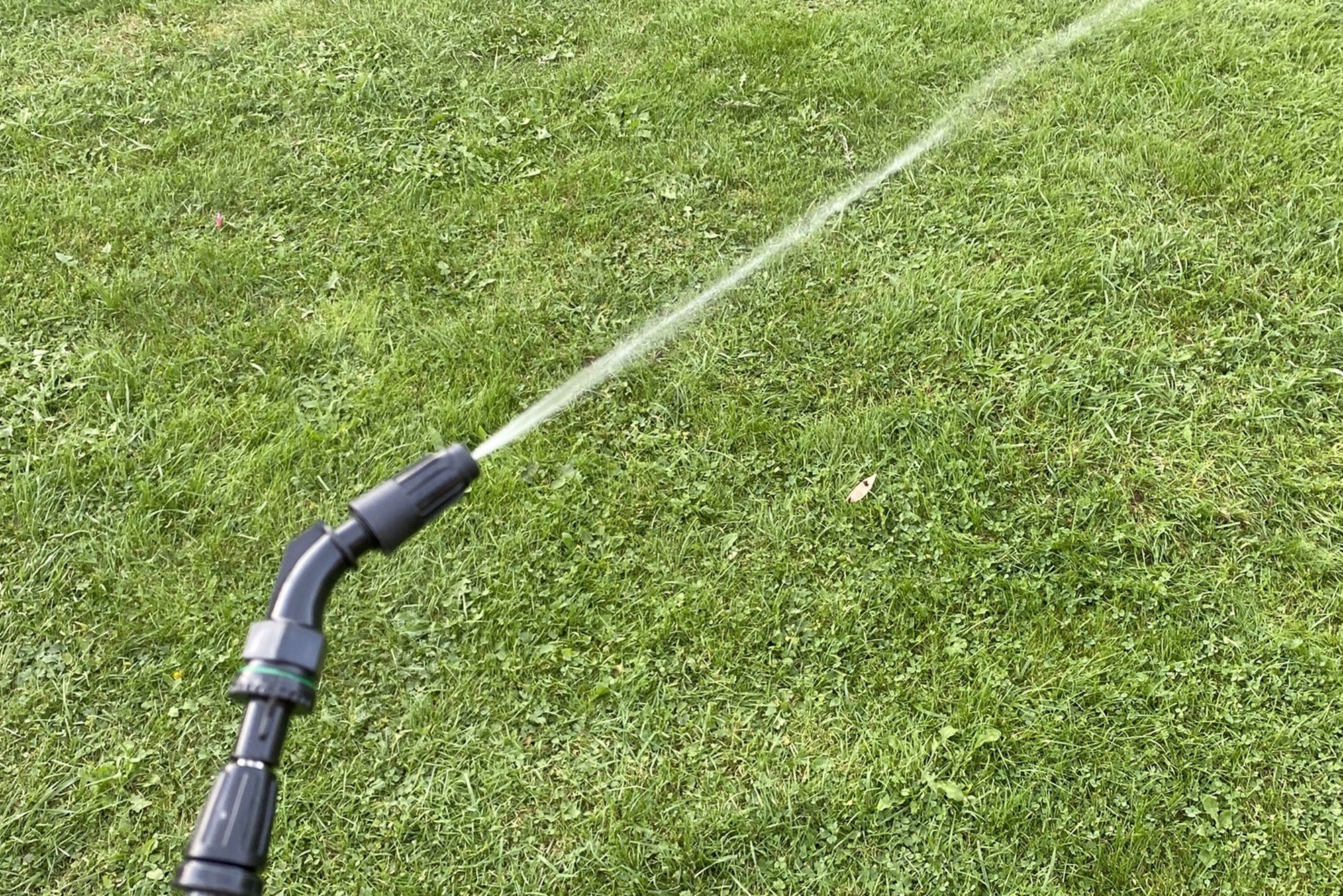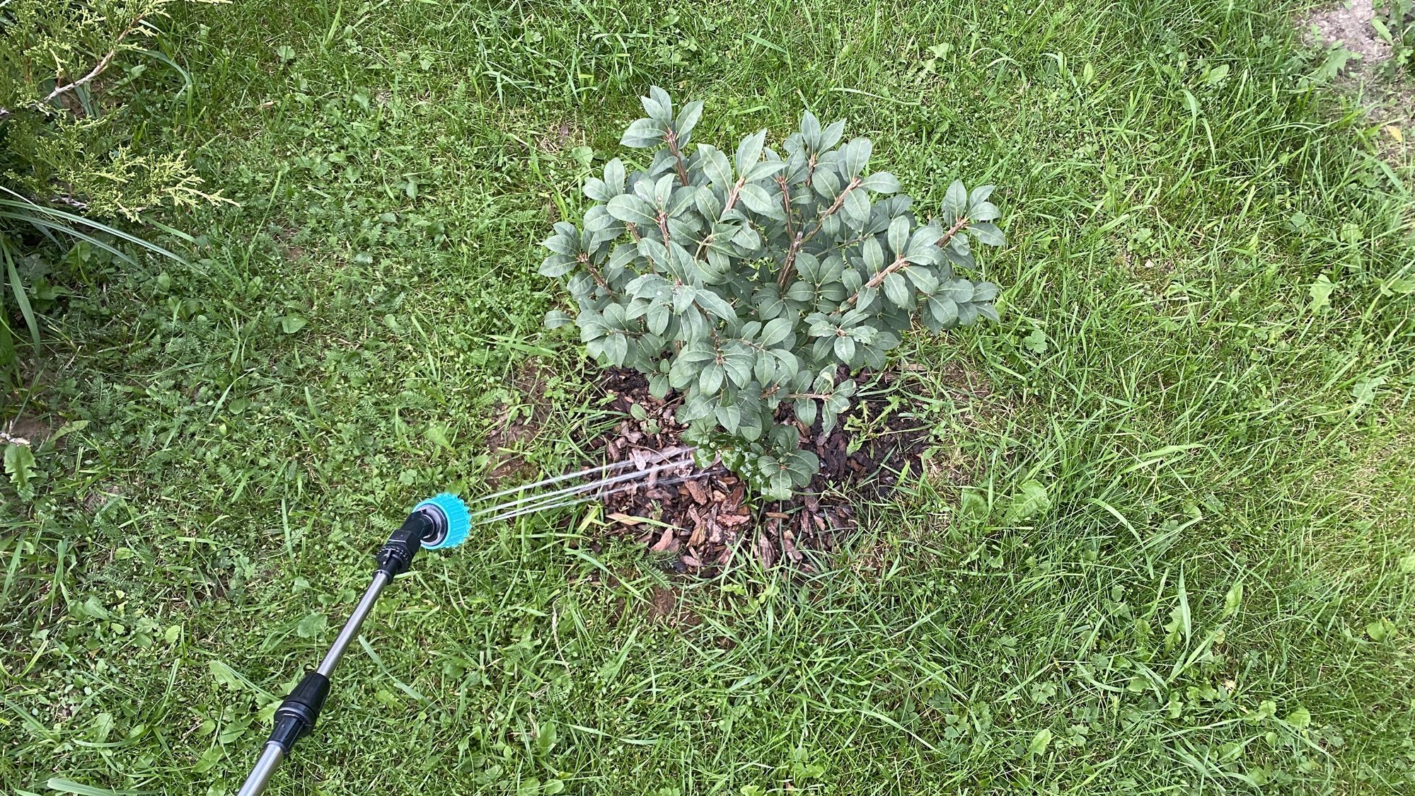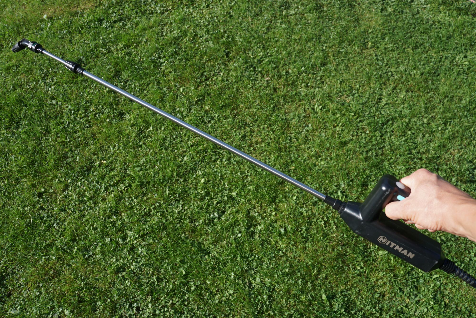 Процесс опрыскивания обзорным аппаратом идет стабильно — насос работает ровно и тихо, равномерно прокачивая жидкость, без рывков и задумчивости (как было на моем прошлом опрыскивателе). Длины штанги в 110 см + длина руки хватает для кустарников, туй, небольших деревьев. Плюс к этому, если сделать конус распрыскиваемой жидкости более узким, то он может бить еще примерно на 1 метр.