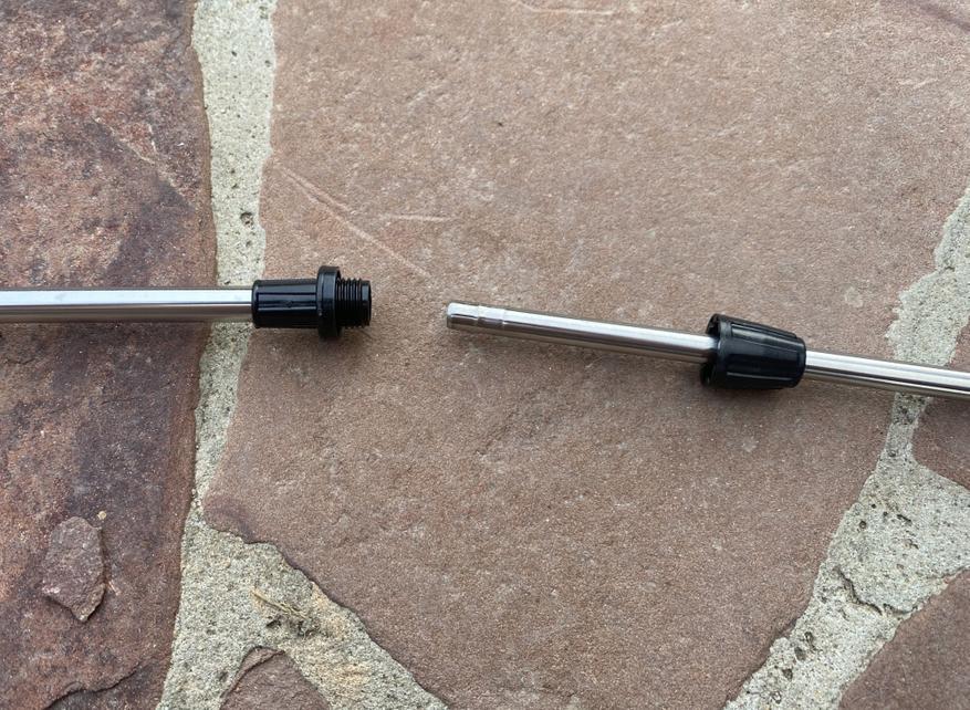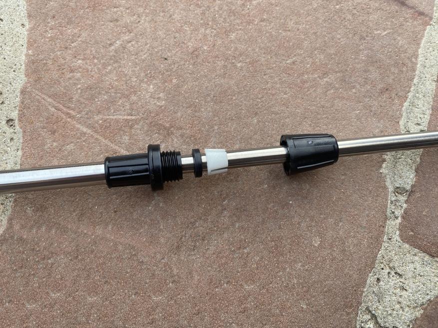 Если же нужно опрыскивать высокие деревья (а у меня есть и такие), то можно приобрести специальный телескопический удлинитель который увеличивает длину штанги до 3.3 метров. Я взял универсальную телескопическую штангу PT-3 и она отлично подошла к данному опрыскивателю. Раньше приходилось лазить на стремянку и чувствовать себя акробатом (вместе с емкостью на плече), пытаясь опрыскать макушки высоких деревьев. Теперь все можно делать с земли. И удивительно, что и на такую высоту опрыскиватель легко забрасывает жидкость.