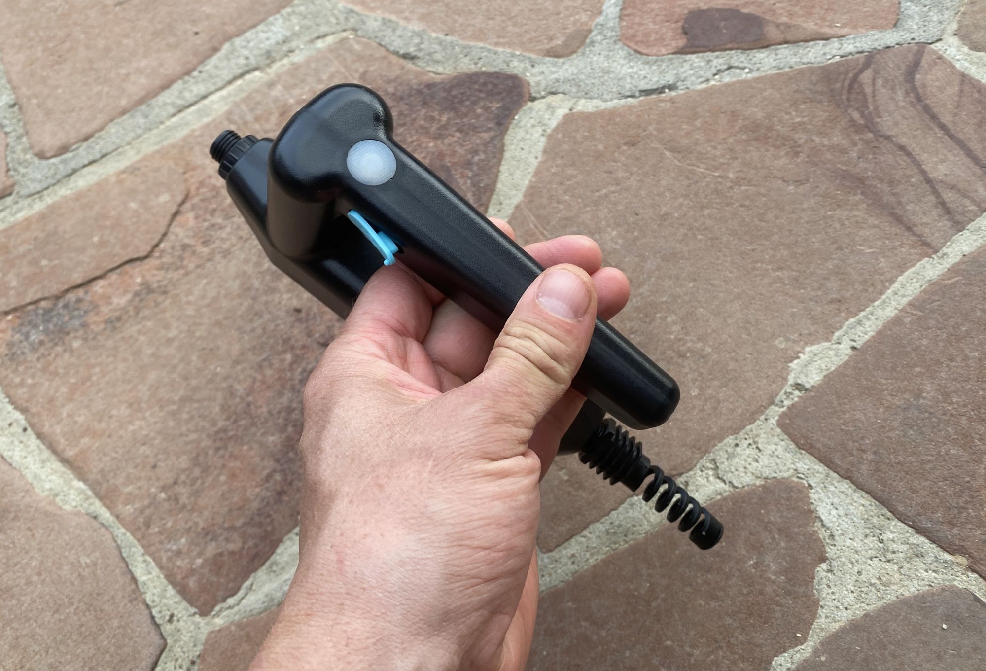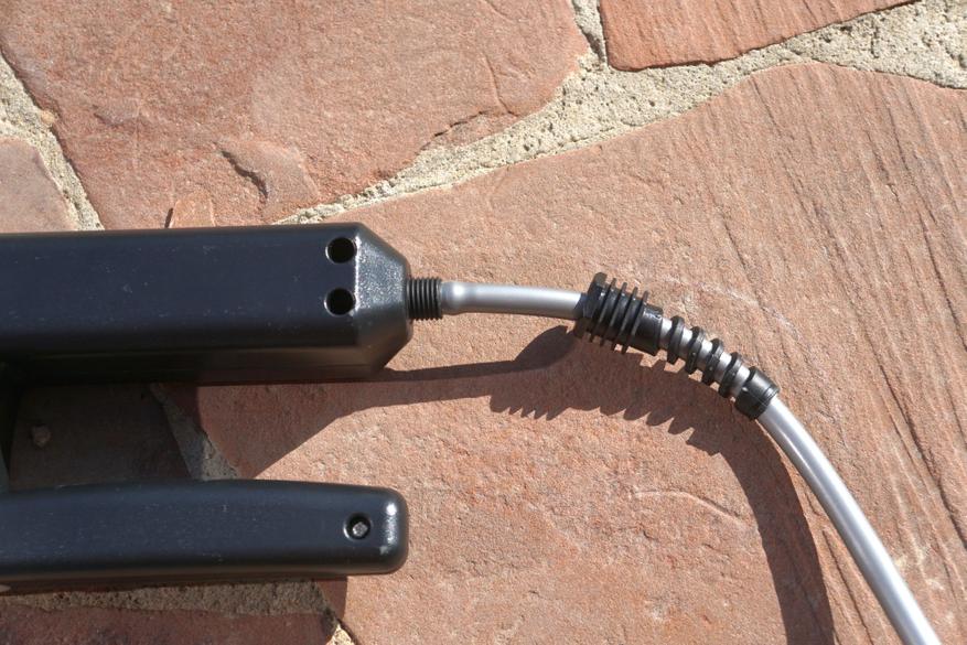 Ввод жидкости для опрыскивания производится снизу, куда подключается длинный прочный шланг к соответствующему штуцеру, устанавливается быстро и просто. Есть спиральная защита от перегибания шланга.