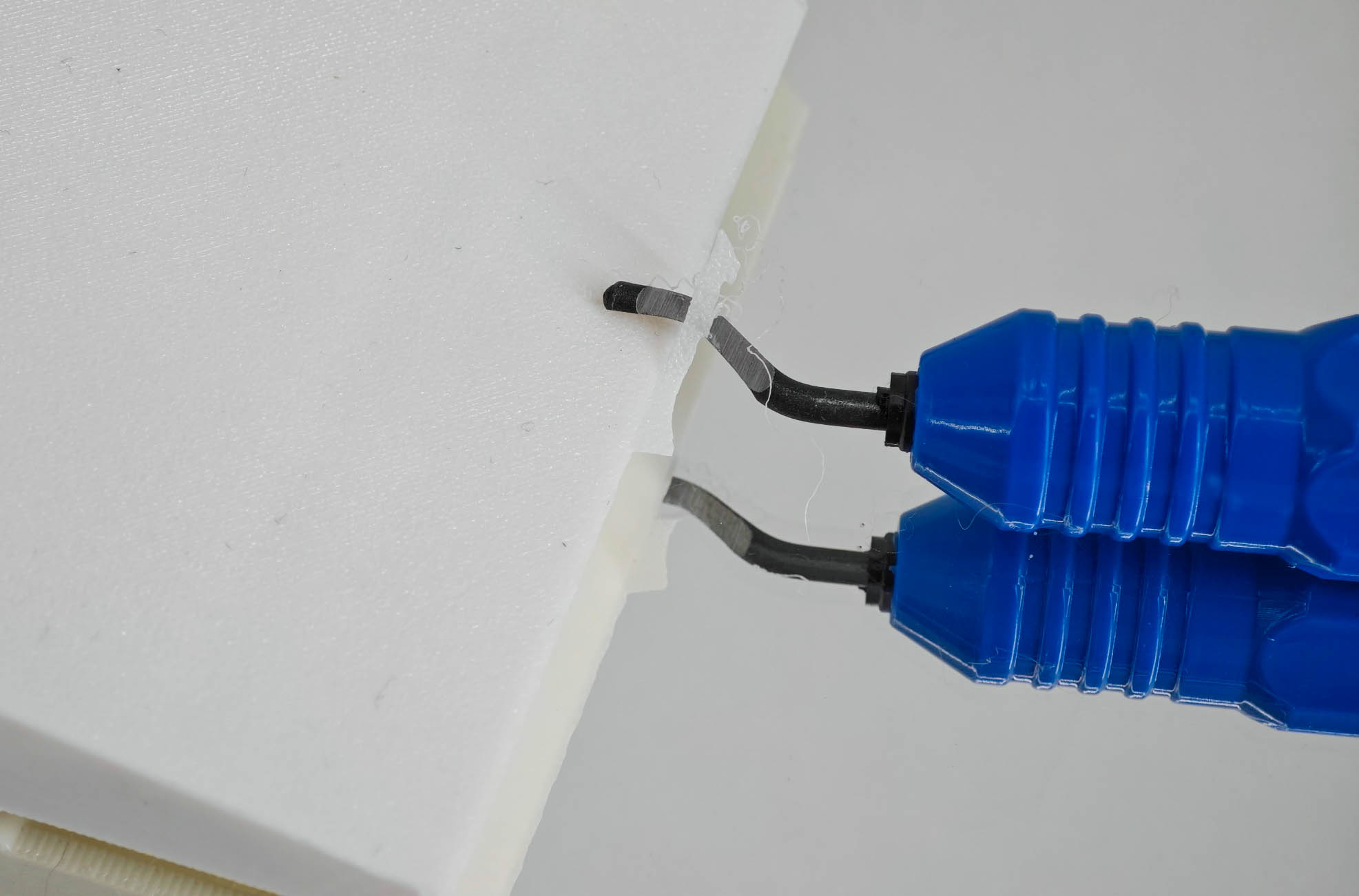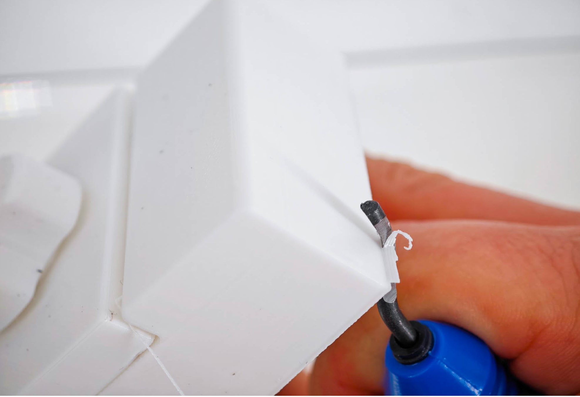 С помощью такого инструмента можно делать и другую обработку, например, выравнивать поверхность, устранять дефекты печати, локальные наплывы, следы от переэкструзии или ретракта, а также убирать заусенцев/облой, которые образуются на стыках слоев или в местах начала/остановки экструзии. Также удобно снимать внешние и внутренние фаски, что особенно критично для отверстий. Можно провести легкую коррекцию геометрии отверстий, зачистить кромки для последующей установки крепежа или запрессовки элементов, что в свою очередь позволяет избежать необходимость сверления в ряде случаев.