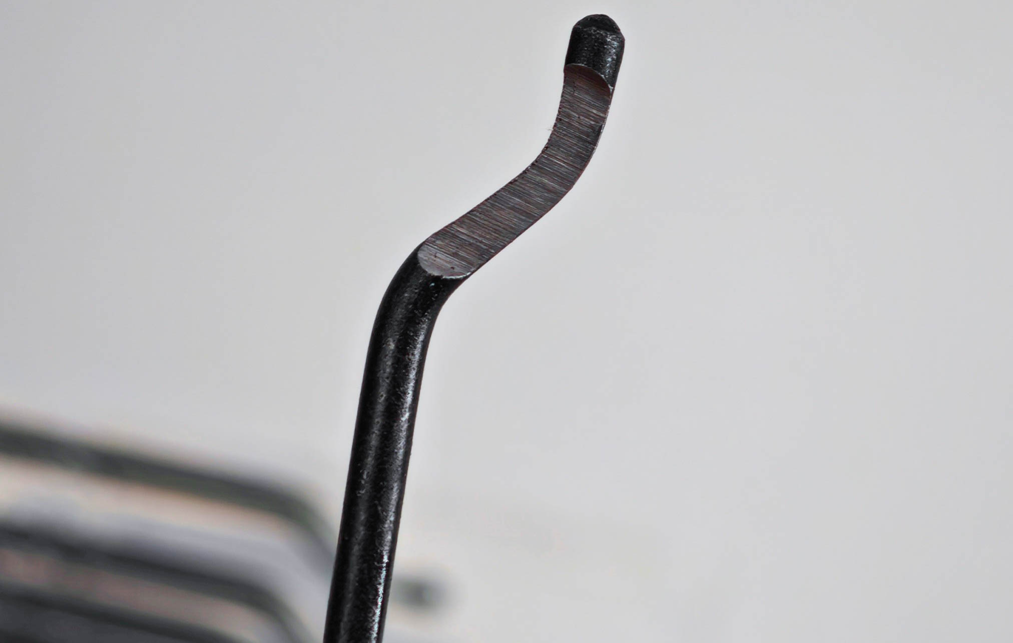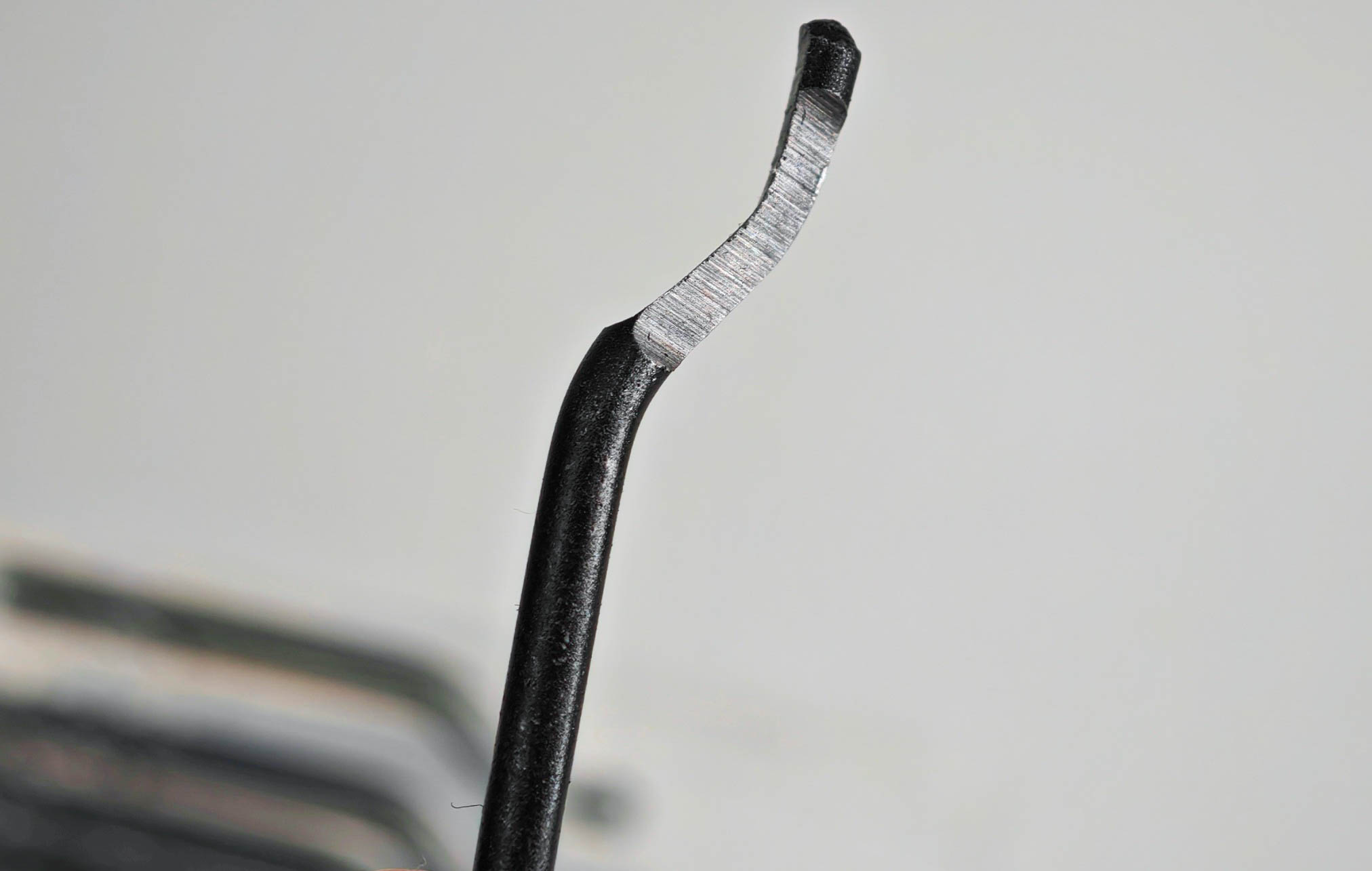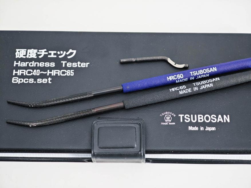 Лезвие для риммера-ручки удалось проверить на твердость материала. Использовал напильники-тестеры с разной насечкой. Получилась средняя твердость между 60 и 65 единиц по Роквеллу. Это довольно хороший показатель, фактически, это высокоуглеродистая быстрорежущая сталь что-то типа аналог P6M5 с закалкой. Конечно, обработка самих насадок оставляет желать лучшего, но рабочая поверхность заточена ровно. С такой твердостью без проблем можно работать как с цветными металлами, так и с мягкими незакаленными сталями твердостью до 50 единиц по Роквеллу, а не только снимать облой с пластика, как это делаю я.