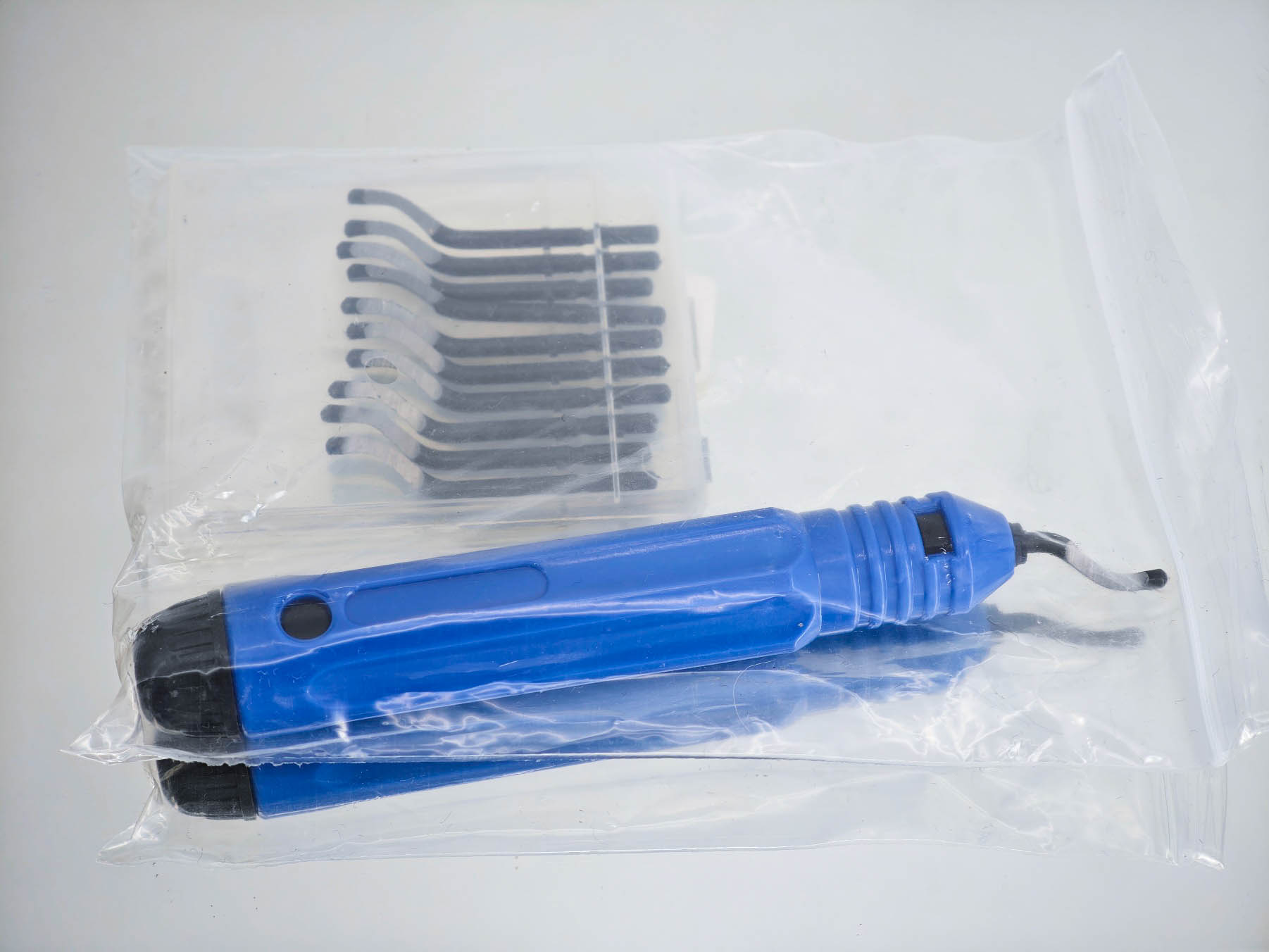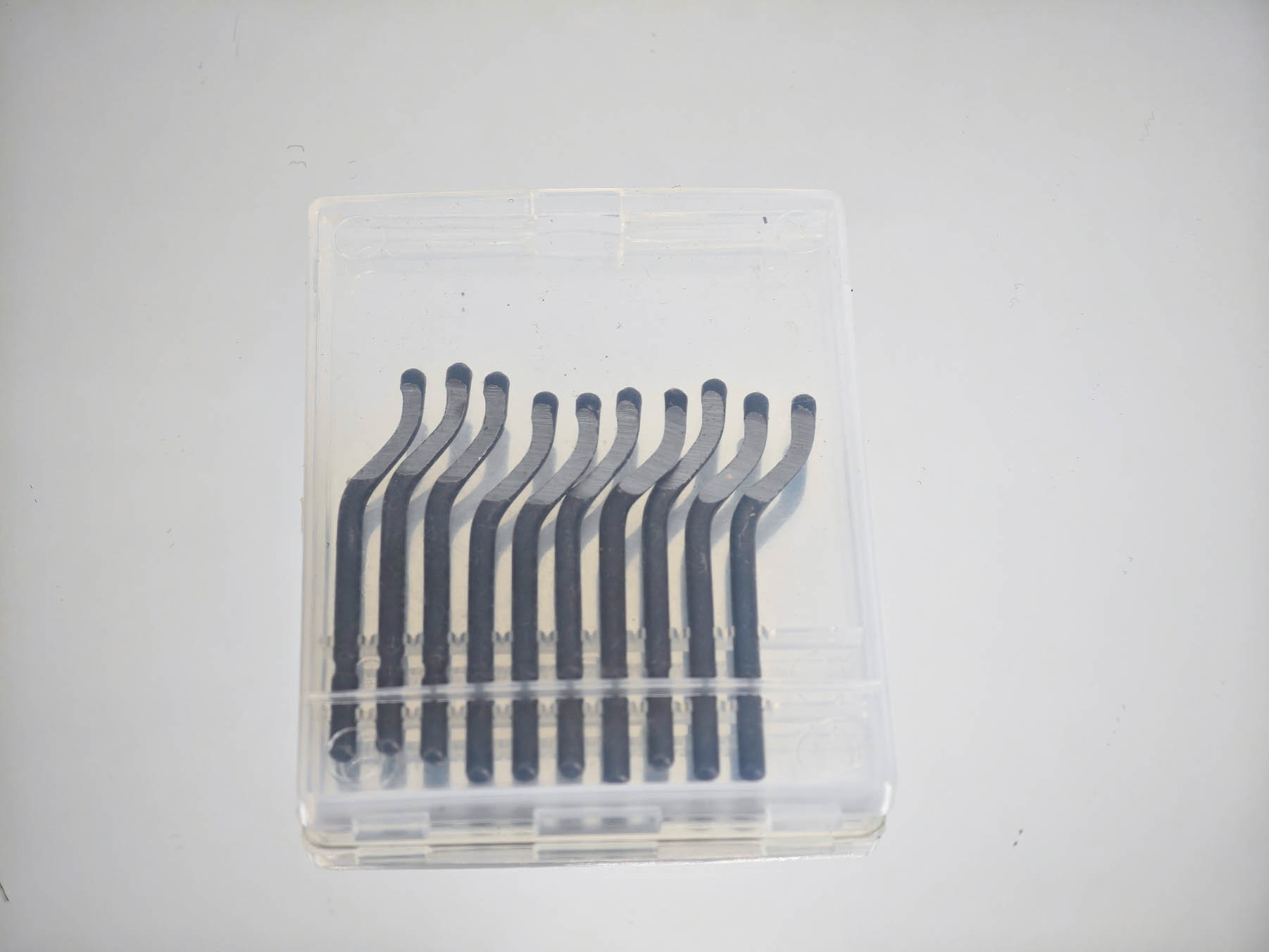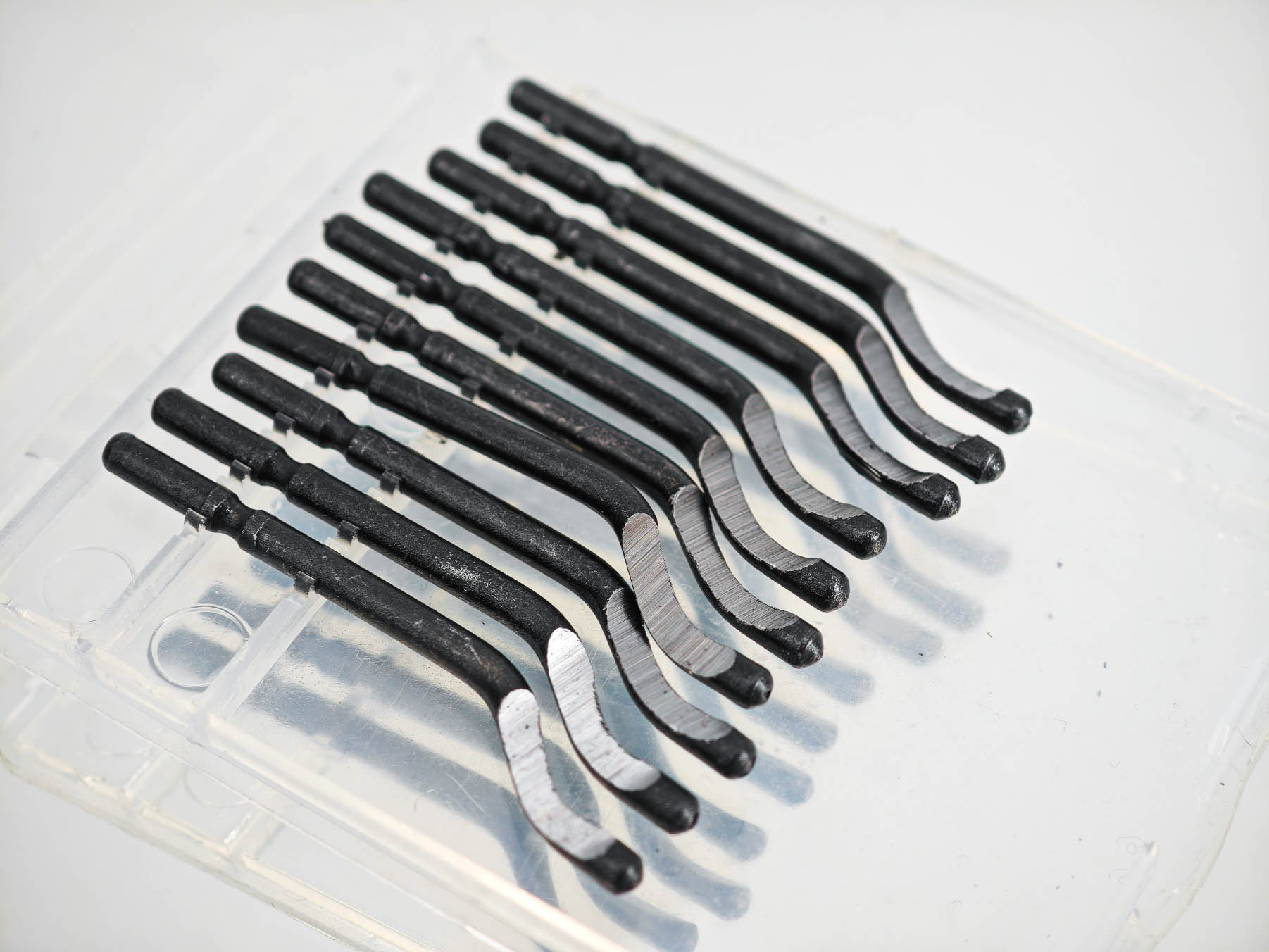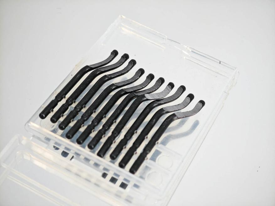 Я выбирал себе комплект держатель + набор насадок. Речь идет про небольшой прозрачный кейс, который пришел в одной посылке с инструментом. В кейсе было десять насадок — твердосплавных лезвий с заточкой рабочей области. Стоит отметить, что форма лезвия такого риммера варьируется в зависимости от характера работ, могут попадаться крючкообразные, изогнутые или прямые насадки, а также могут отличаться материалы, в зависимости от материалов для обработки. В этом плане важно понимать, что вы купили — не стоит снимать заусенцы с металлической детали риммером с насадками под пластик.
