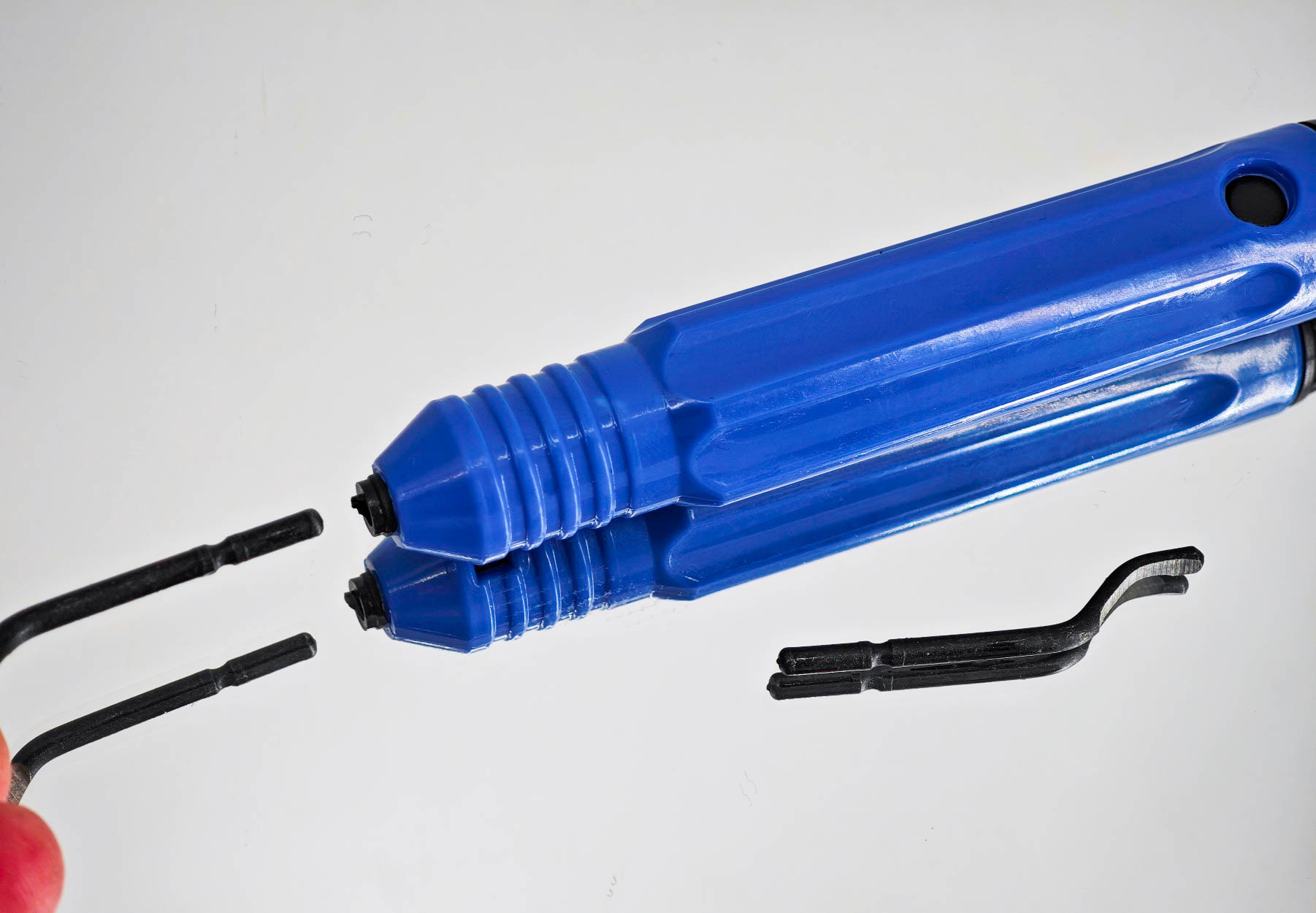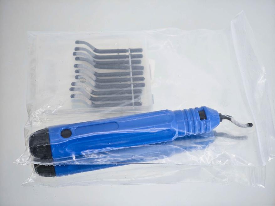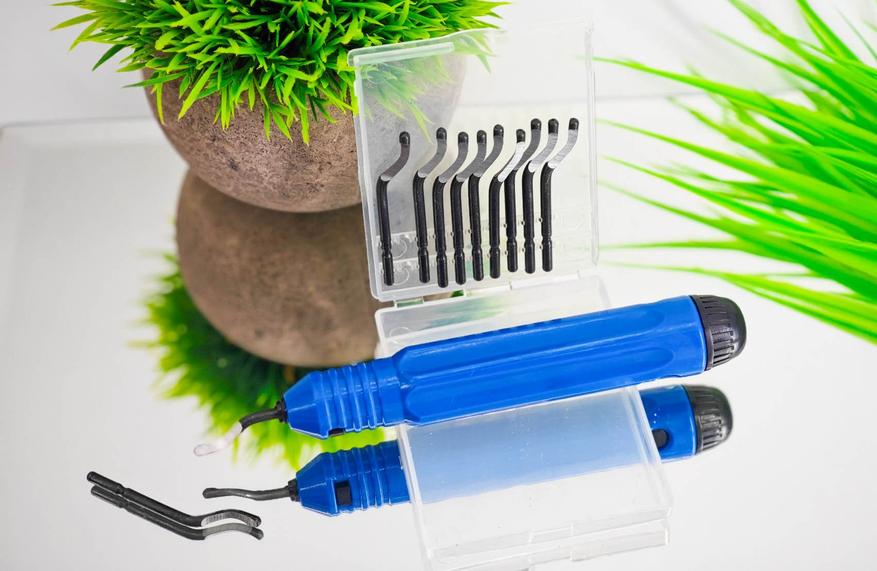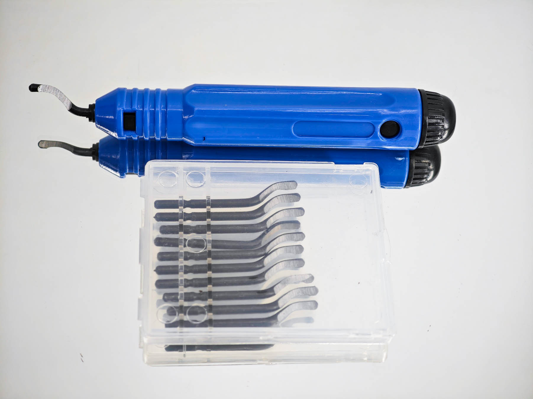 Я выбирал себе комплект держатель + набор насадок. Речь идет про небольшой прозрачный кейс, который пришел в одной посылке с инструментом. В кейсе было десять насадок — твердосплавных лезвий с заточкой рабочей области. Стоит отметить, что форма лезвия такого риммера варьируется в зависимости от характера работ, могут попадаться крючкообразные, изогнутые или прямые насадки, а также могут отличаться материалы, в зависимости от материалов для обработки. В этом плане важно понимать, что вы купили — не стоит снимать заусенцы с металлической детали риммером с насадками под пластик.