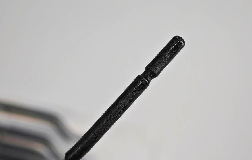 Собственно говоря, фиксация сменного режущего элемента (лезвия или насадки) производится с помощью небольшого пластикового зажима в носовой части держателя. Для того чтобы освободить от зажима хвостовик насадки (или наоборот, для того чтобы поджать хвостовик), нужно нажать на «пенёк» из черного пластика в носовой части держателя. А в хвостовой части насадки предусмотрена небольшая кольцевая проточка, обеспечивающая не только надежное крепление в зажиме, но и возможность вращения при работе.