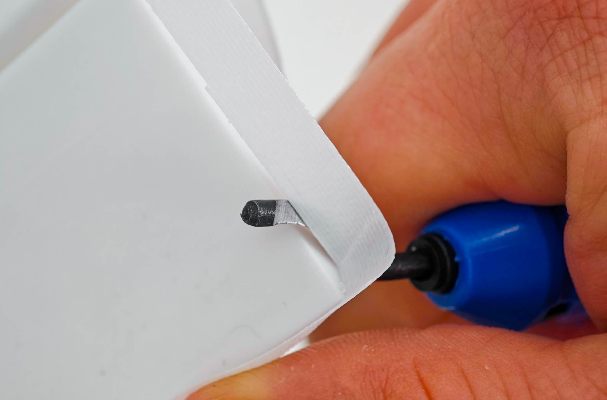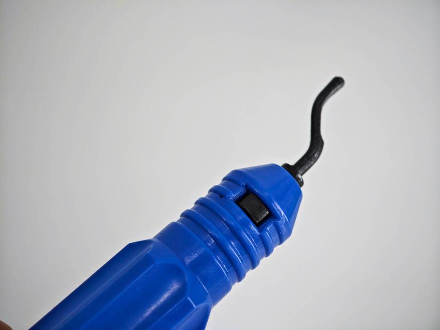 По своей сути, это и есть ручка, но со специальными насадками — это твердосплавные заточенные лезвия с проточкой для быстрой фиксации на корпусе рукоятки. Корпус легкий, пластиковый, внутри есть полость, которая закрывается крышкой. По идее, в этой полости можно хранить запасные насадки — в этом случае все для работы будет под рукой.