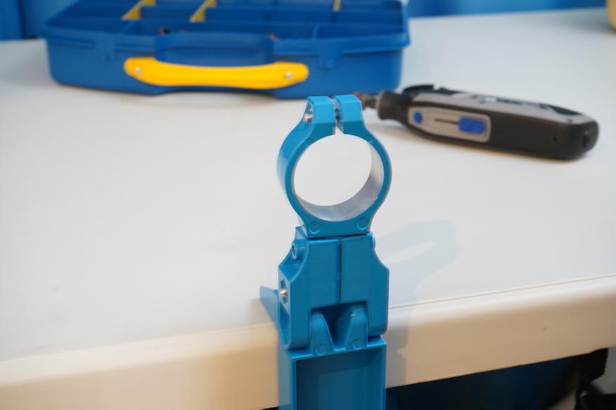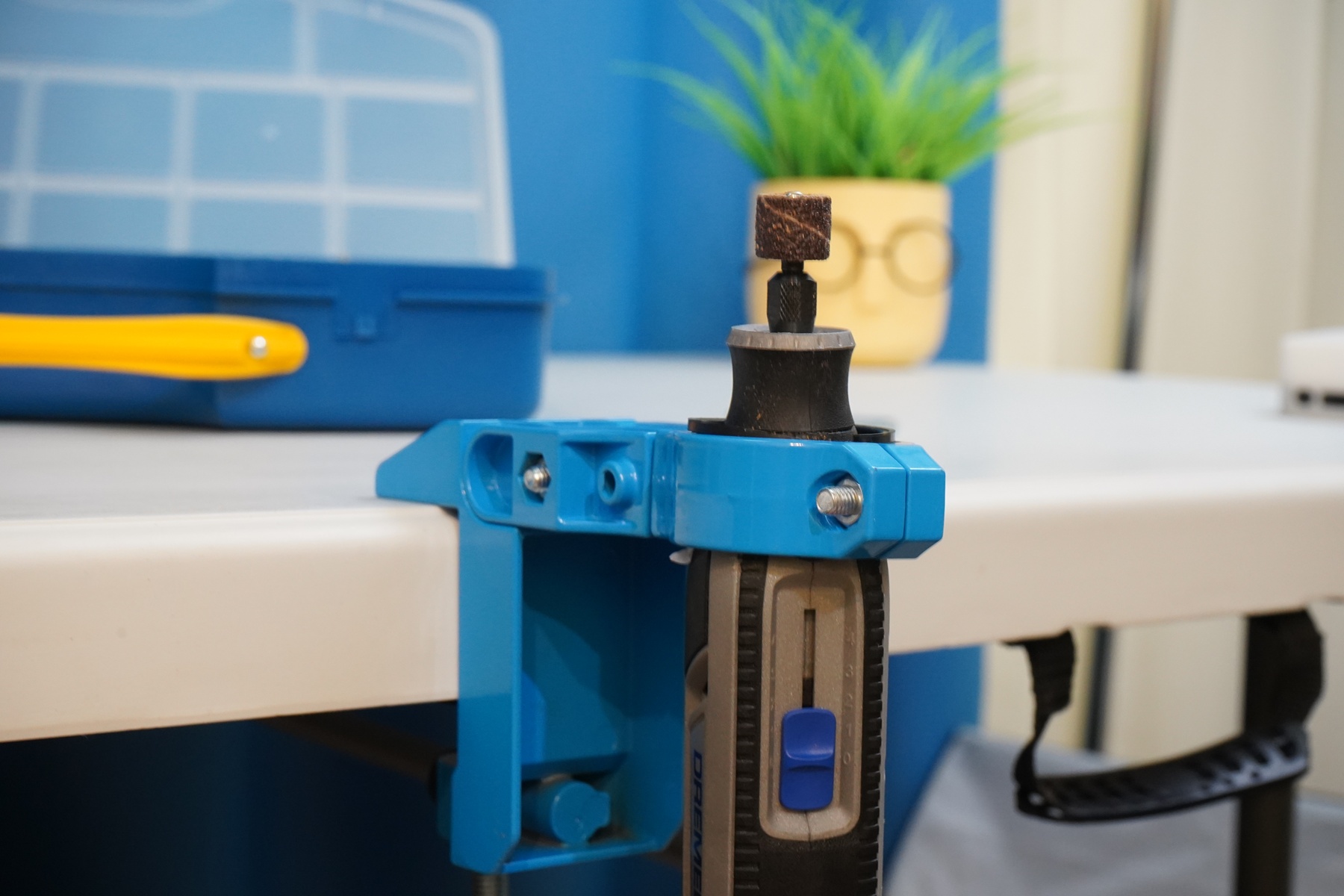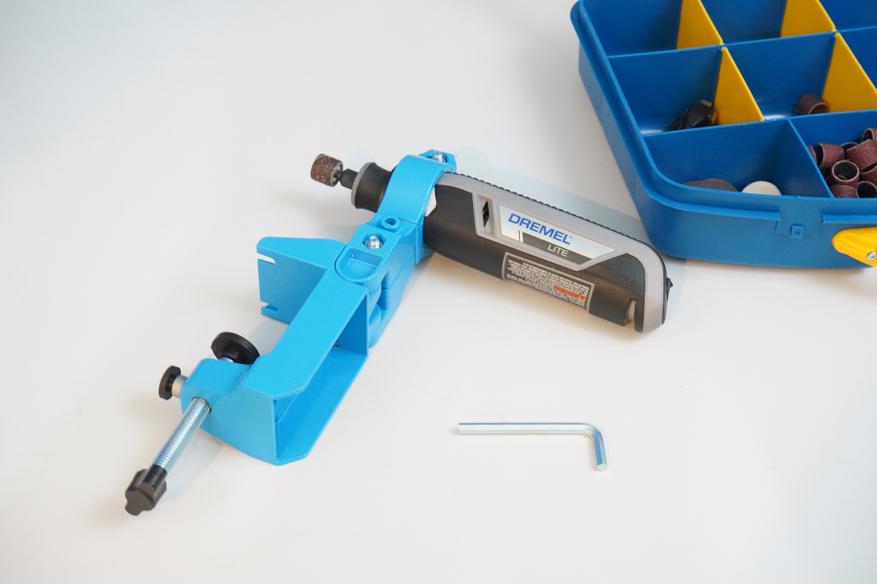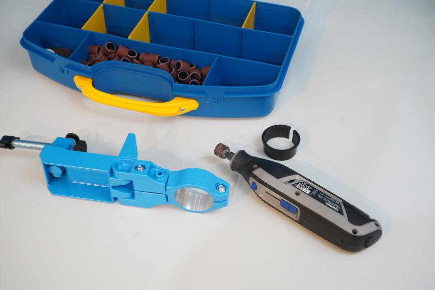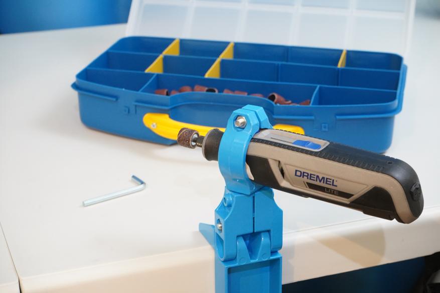 Из-за упрощенной конструкции прижима качественно зажимать будет только корпуса инструмента с правильной цилиндрической формой. Конусы или, как в моем случае, прямоугольные корпуса будут держаться хуже. В моем случае можно будет решить с 3Д печатной вставкой, но это отдельный вопрос на будущее. Я устанавливал компактный аккумуляторный дремель с использованием одного из штатных колец. Из минусов стоит отметить невозможность фиксации дрели за патрон (не будет вращаться), а также неудобство с дремелями — кольцо фиксируется в том месте, в котором на корпусе размещается стопор вала, то есть замена оснастки потребует демонтажа инструмента из стойки. С другой стороны, можно не просто зафиксировать инструмент для работы, но и выбрать нужное положение/угол. Отмечу возможность работы с гибким валом.