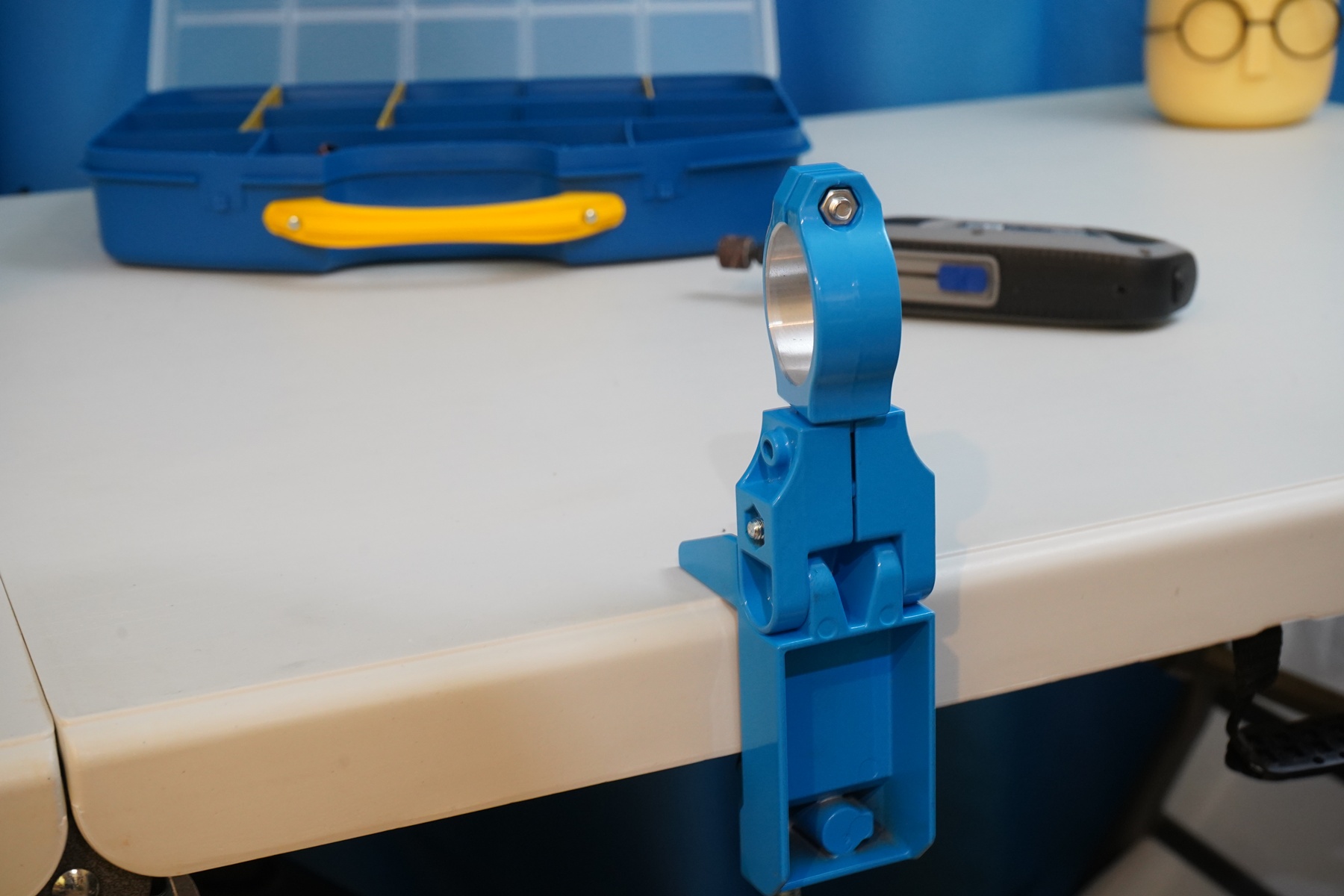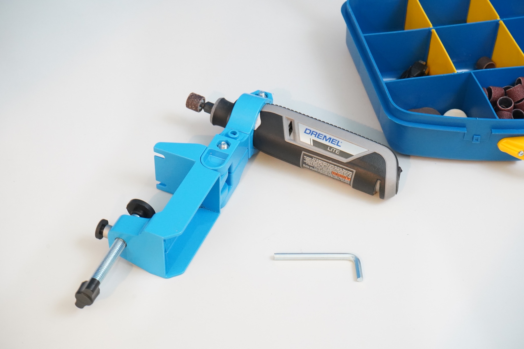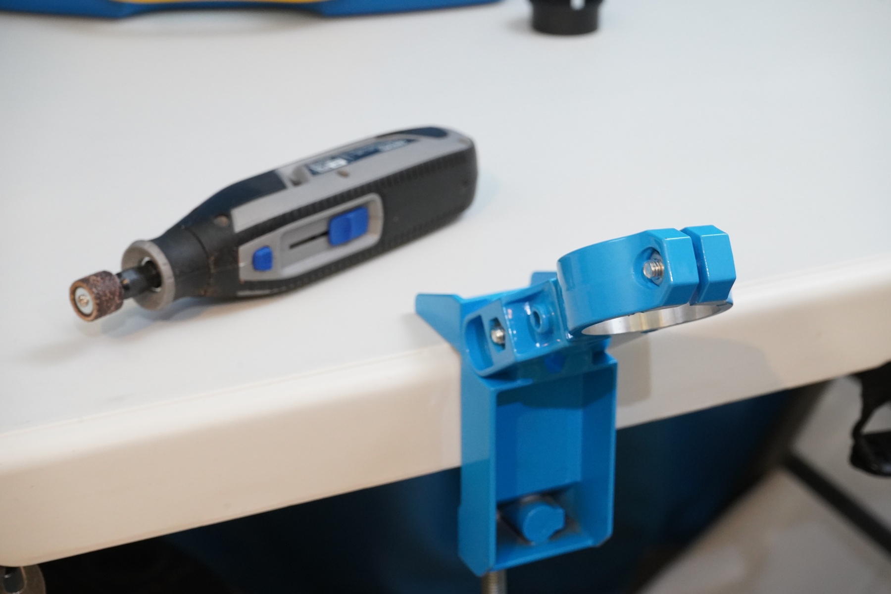 Из-за упрощенной конструкции прижима качественно зажимать будет только корпуса инструмента с правильной цилиндрической формой. Конусы или, как в моем случае, прямоугольные корпуса будут держаться хуже. В моем случае можно будет решить с 3Д печатной вставкой, но это отдельный вопрос на будущее. Я устанавливал компактный аккумуляторный дремель с использованием одного из штатных колец. Из минусов стоит отметить невозможность фиксации дрели за патрон (не будет вращаться), а также неудобство с дремелями — кольцо фиксируется в том месте, в котором на корпусе размещается стопор вала, то есть замена оснастки потребует демонтажа инструмента из стойки. С другой стороны, можно не просто зафиксировать инструмент для работы, но и выбрать нужное положение/угол. Отмечу возможность работы с гибким валом.