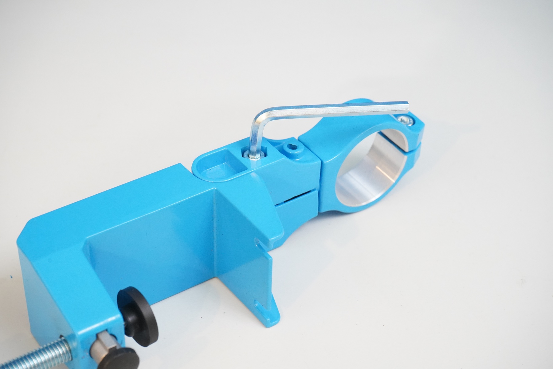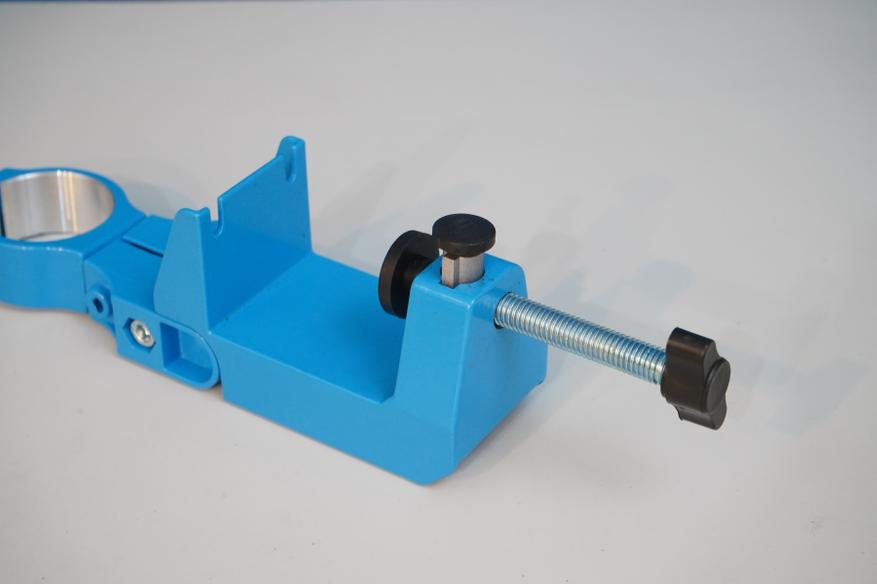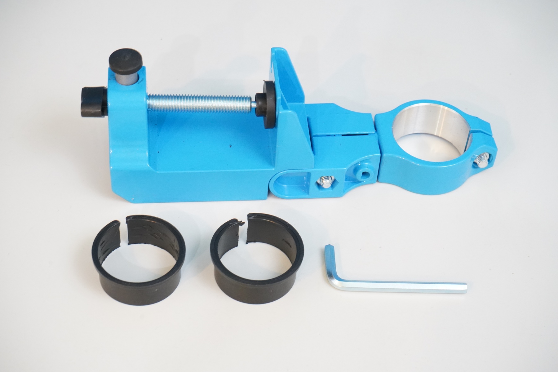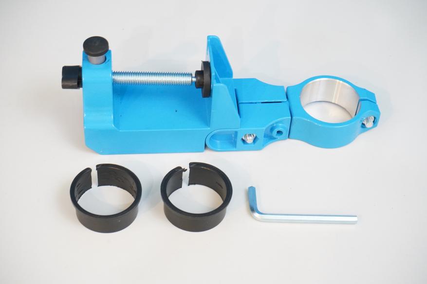 Внутри была самая стойка (у меня алюминий, окрашенный в голубоватый цвет), два переходных кольца для инструмента различного диаметра, а также Г-образный ключ-шестигранник. Ключ в последствии поможет фиксировать как само основании, так и «шейку» инструмента в зажиме. Инструкции в комплекте не было, да и не нужна она — все и так предельно понятно.