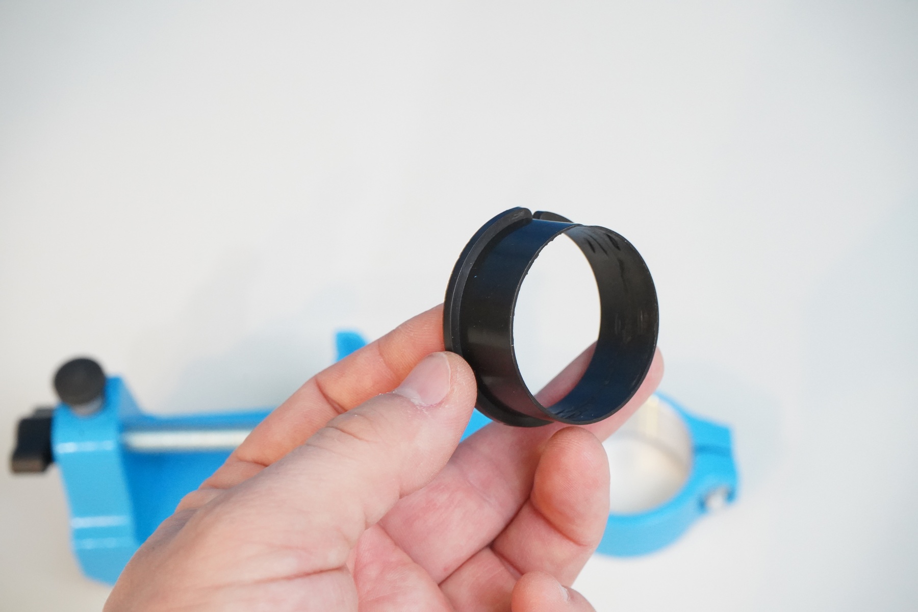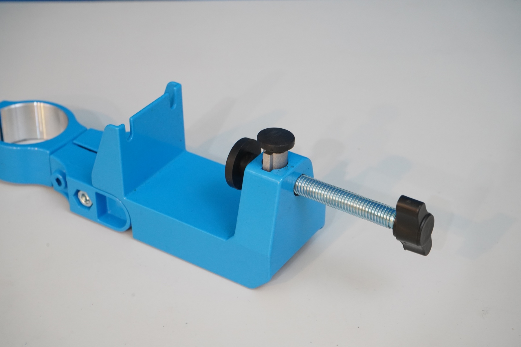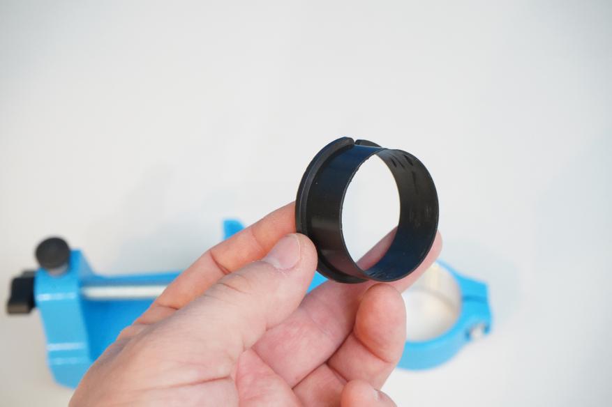 Внутри была самая стойка (у меня алюминий, окрашенный в голубоватый цвет), два переходных кольца для инструмента различного диаметра, а также Г-образный ключ-шестигранник. Ключ в последствии поможет фиксировать как само основании, так и «шейку» инструмента в зажиме. Инструкции в комплекте не было, да и не нужна она — все и так предельно понятно.