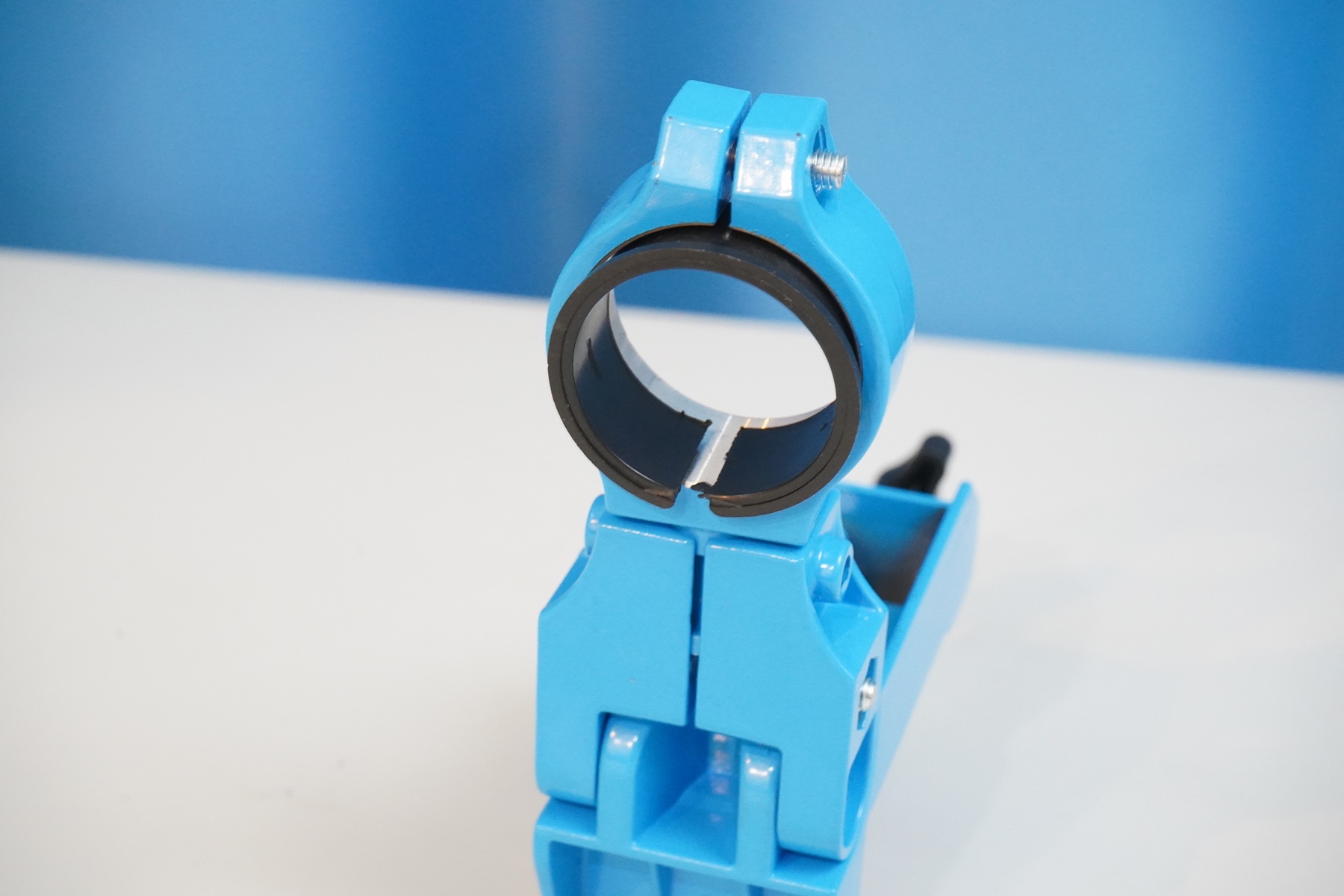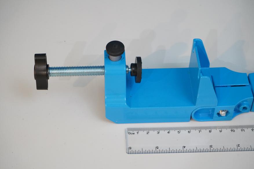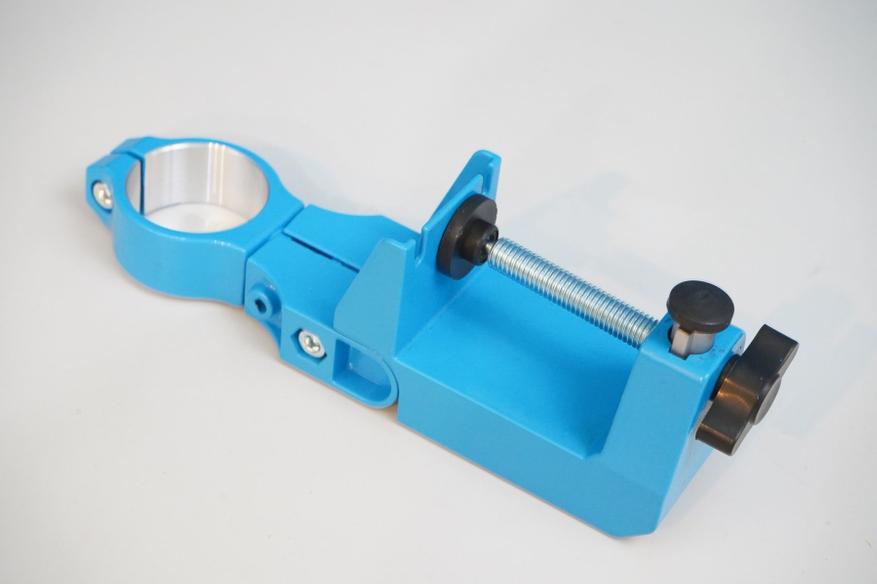 Стойка довольно компактная, по крайней мере, я видел другие варианты, которые казались более громоздкими для работы на столе. Длина корпуса в обычном положении около 20 сантиметров, при «сгибании» в шарнире стойка складывается практически пополам (высота «половинок» получается около 10 сантиметров). Диапазон толщины столешницы для фиксации составляет около 6-7 сантиметров — с приличным запасом. Чистый размер «шейки» составляет 44 миллиметра, с кольцами можно уменьшить до 38-40 миллиметров. Это позволяет зажать небольшой гравер или небольшую дрель.