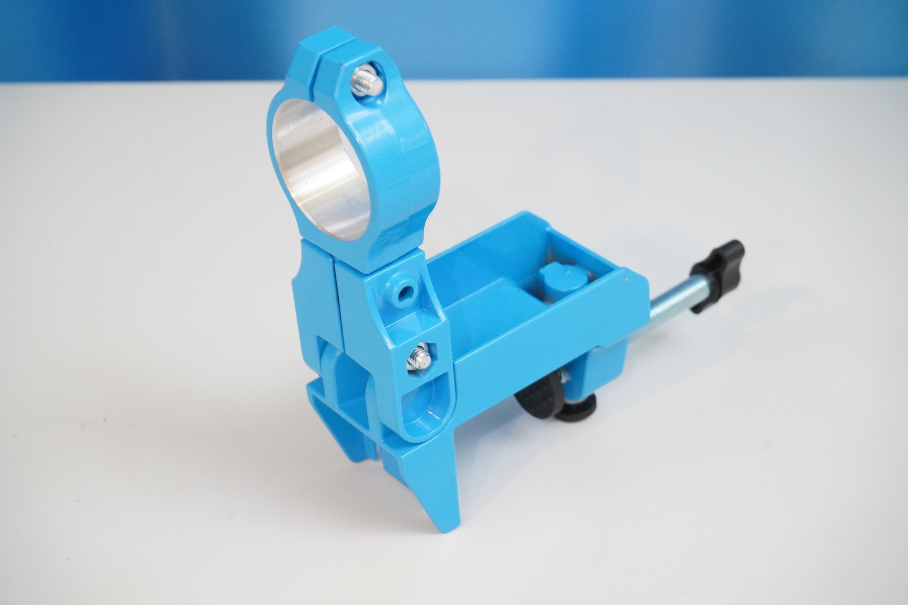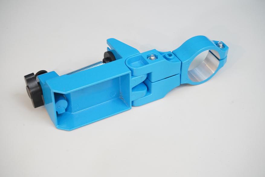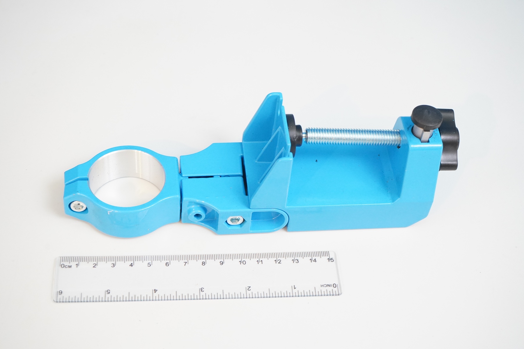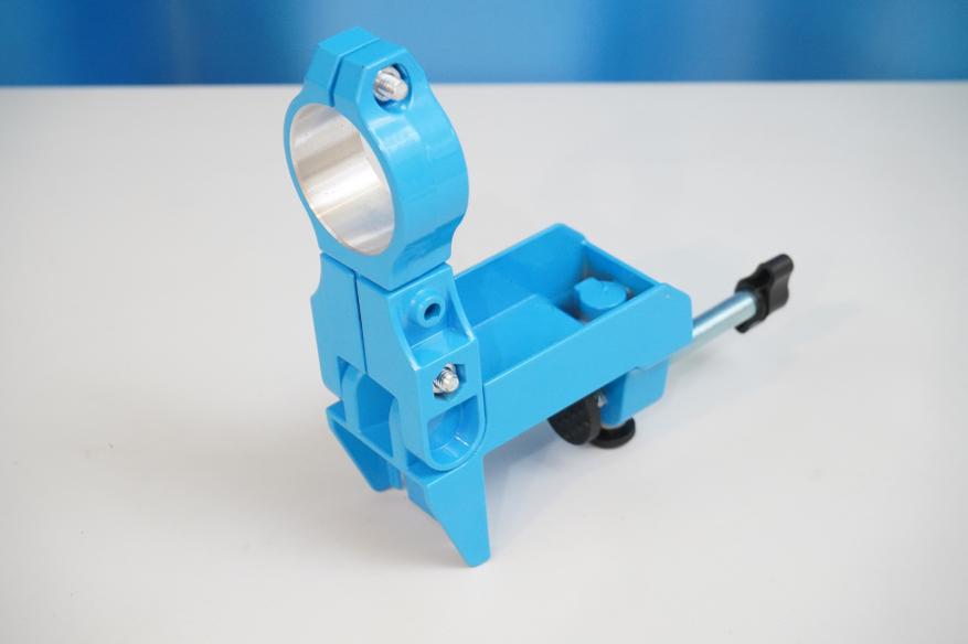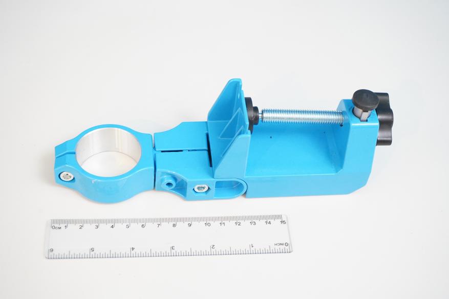Итак, пара слов про внешний вид стойки. Это довольно компактная, я бы даже сказал — плоская, конструкция выполненная методом литья из алюминиевого сплава. Облегченная — часть деталей выполнена с нишами для уменьшения массы без влияния на жесткость. Основная часть стойки — основание С-образной формы с винтом-прижимом. Далее идет наклонная часть из двух половинок, к которой крепится деталь-кольцо. Деталь-кольцо имеет разрез с винтовым зажимом, в которое, по задумке разработчиков, зажимается корпус или иная неподвижная часть инструмента.