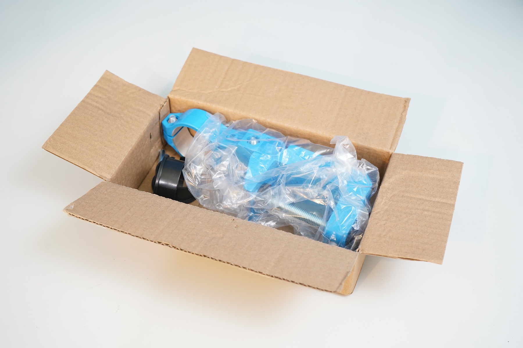 Собственно говоря, про эти стойки я знал давно, вот только покупать пластиковую не хотелось — искал именно металлическую. На фотографии — упаковка с алюминиевой зажимной стойкой на столешницу. Одна из её особенностей — возможность поворота основания, что позволяет не только закреплять инструмент в удобном положении, но и работать с гибким валом. Заказывал из-за рубежа, по времени доставки около трех недель (не страшно), пришла вот такая посылка в картонной коробке.