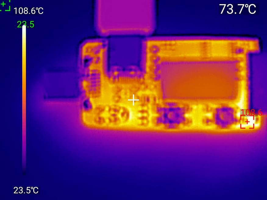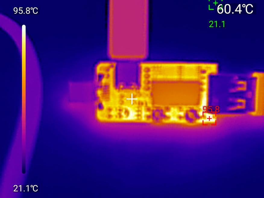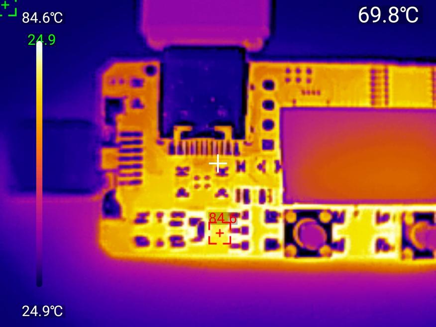 При высоких нагрузках устройство заметно нагревается — более 80 градусах на элементах. Продолжительная работа на максимальных параметрах (28В при токе 5А) требует контроля температуры, защиты по перегреву тут никакой нет, но плата выдерживает более часа максимальной нагрузки.
