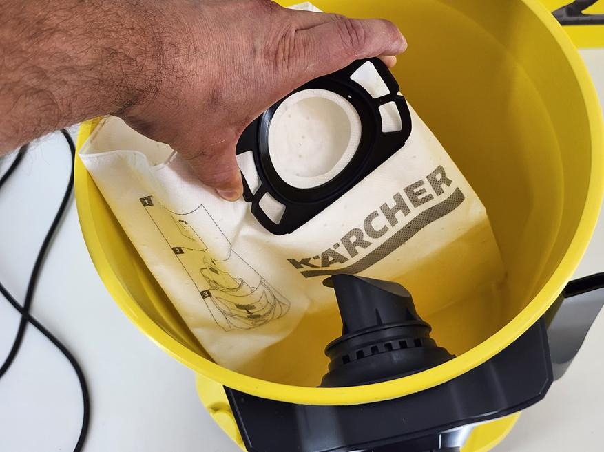 Пользователю предлагается выбор — использовать ли мешок для сбора мусора или не использовать. С мешком проще удалять собранный мусор и опустошать резервуар, с другой стороны появляется потребность в расходных материалах. Также мешок рекомендуется для сбора мелкой пыли, так как улучшает фильтрацию выдуваемого воздуха, что сохраняет ресурс самого пылесоса. А вот при работе со сбором влажных отходов или с крупным мусором мешок лучше снять — помыть сам резервуар от грязи будет проще. Выдуваемый воздух фильтруется через большой патронный фильтр. Для переноски пылесоса удобно пользоваться верхней складной ручкой.