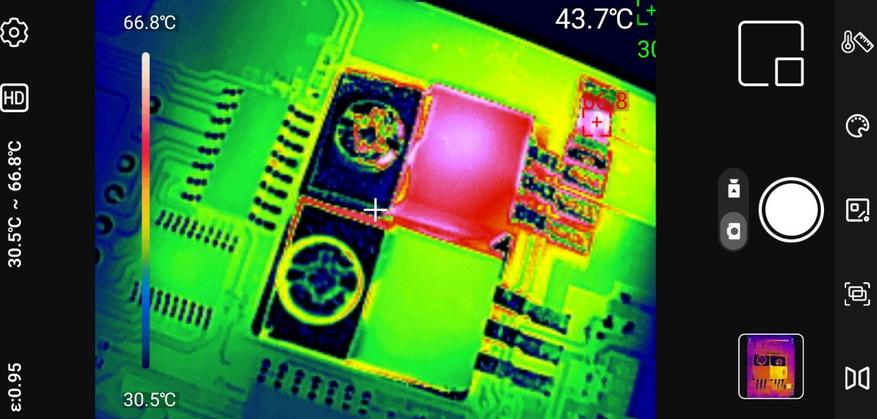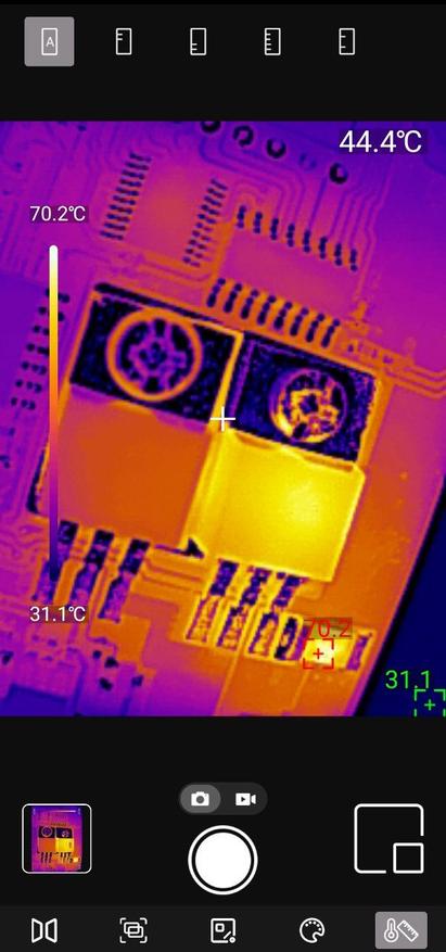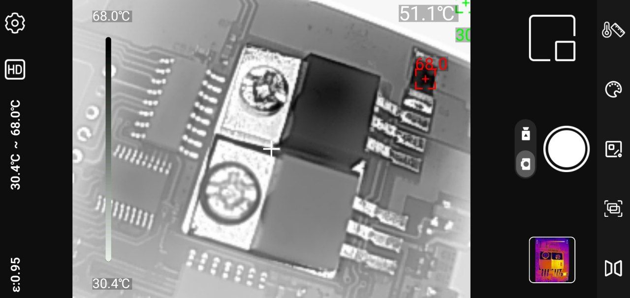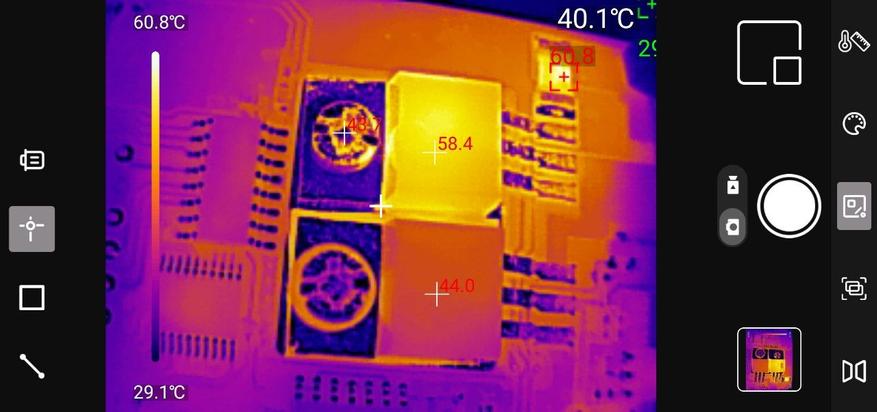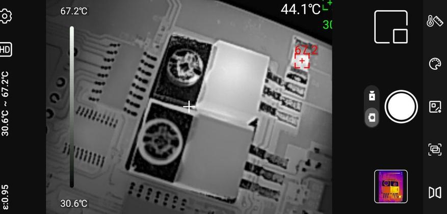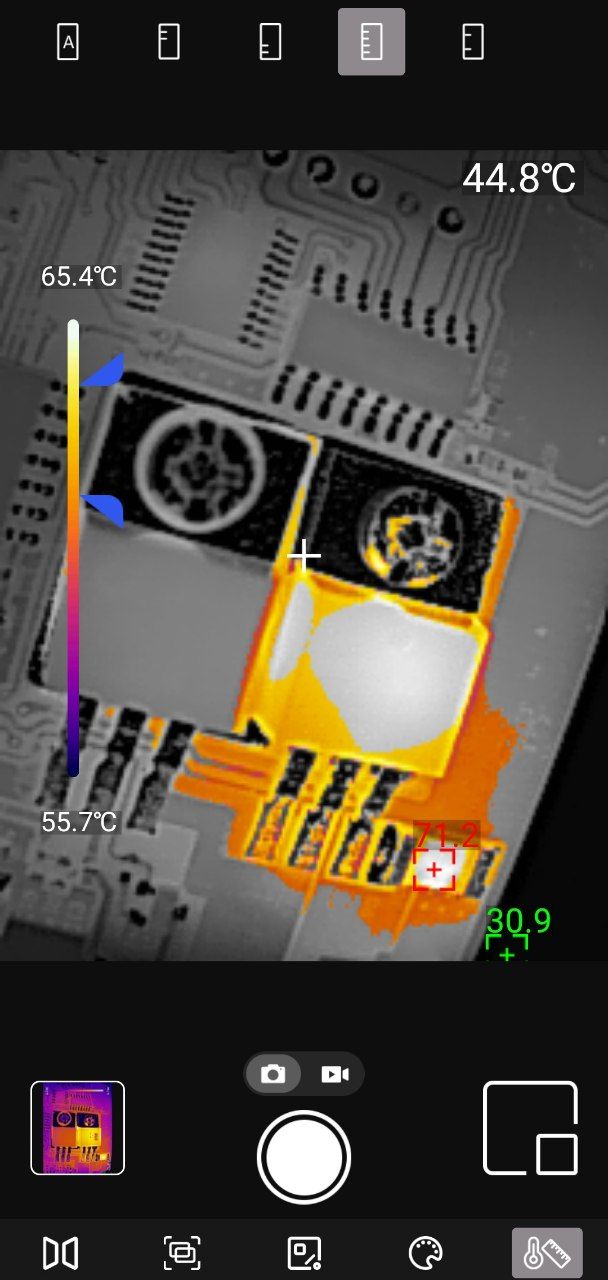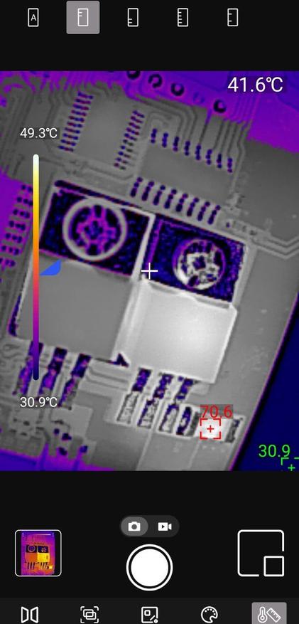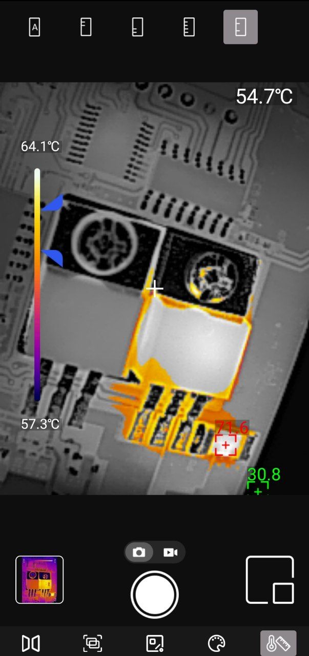 Точечные измерения: Приложение позволяет установить до трёх измерительных точек на изображении. Для каждой точки отображается текущая, максимальная и минимальная температура. Критические значения выделяются цветовыми маркерами — удобно для быстрой оценки ситуации.
