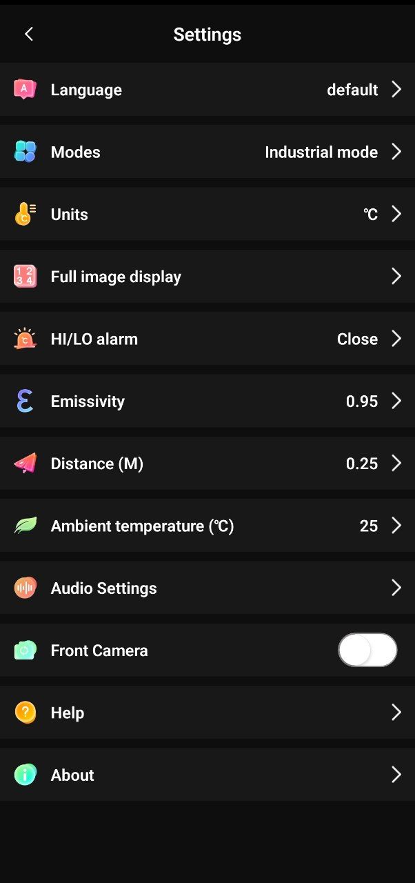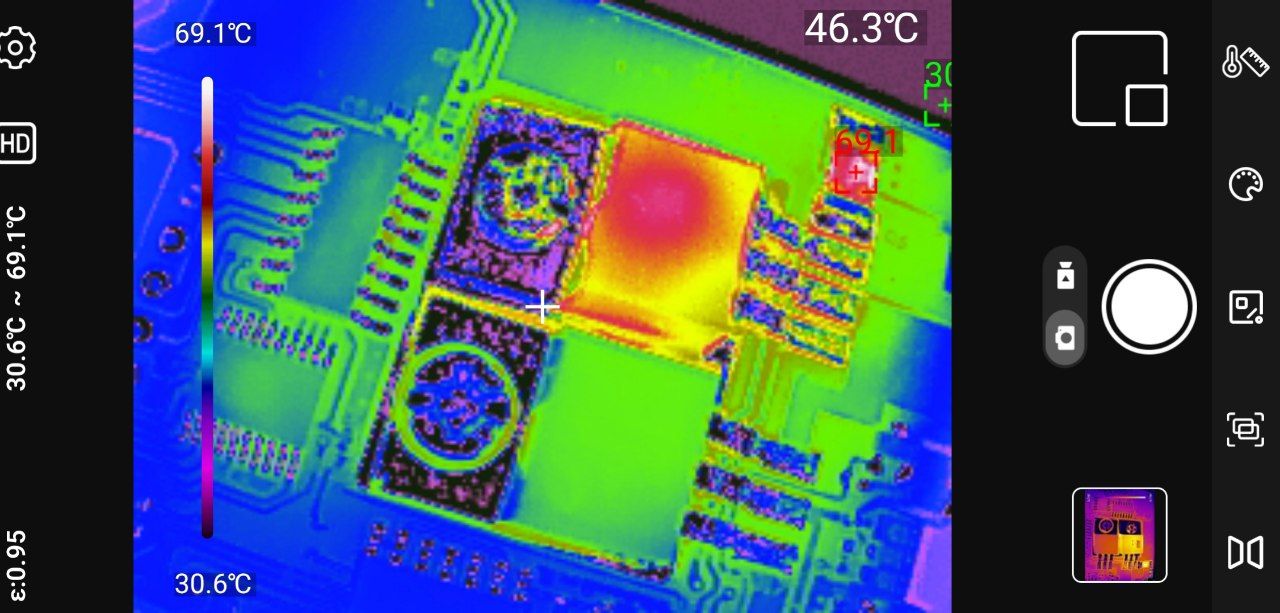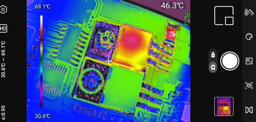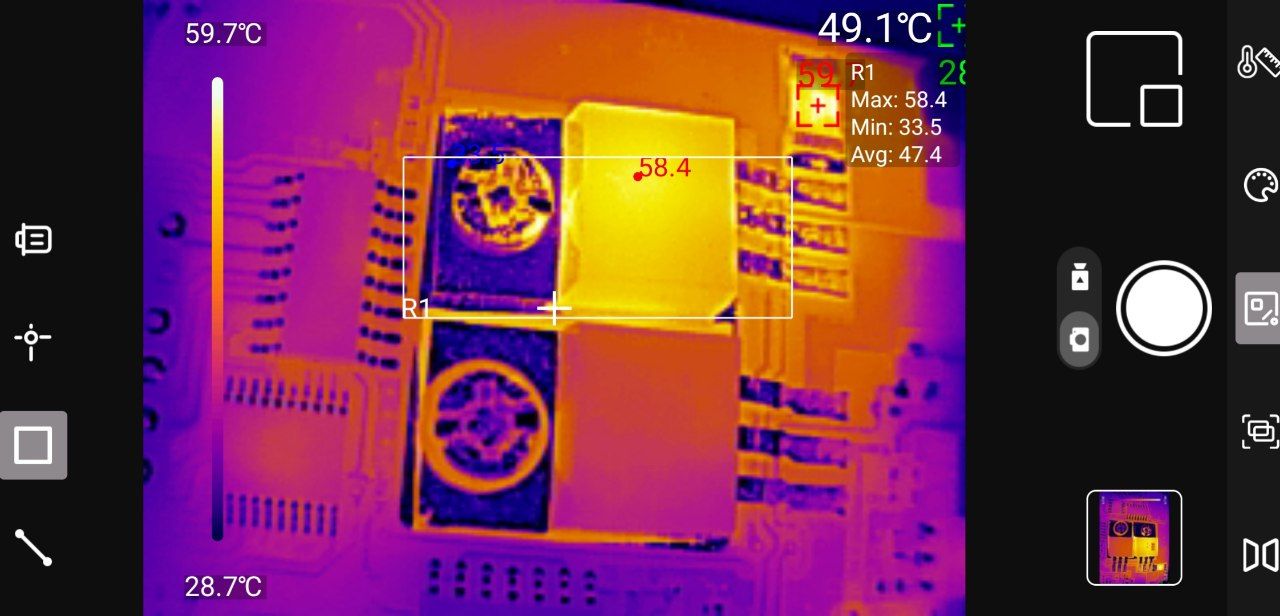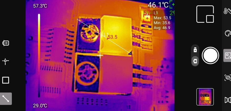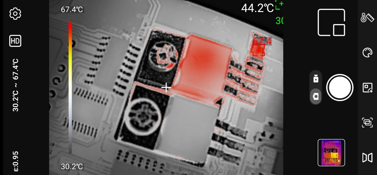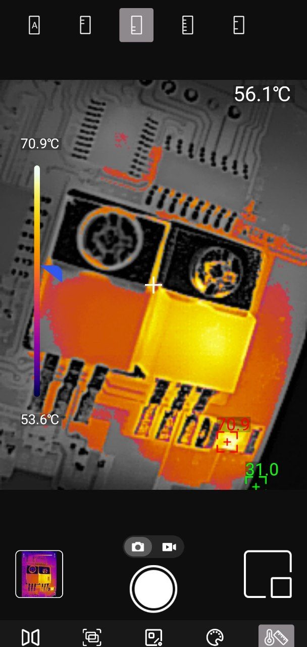 Точечные измерения: Приложение позволяет установить до трёх измерительных точек на изображении. Для каждой точки отображается текущая, максимальная и минимальная температура. Критические значения выделяются цветовыми маркерами — удобно для быстрой оценки ситуации.