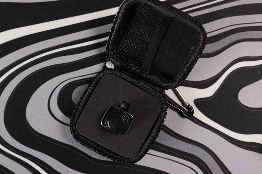 Защитный чехол заметно отличается от компактных пластиковых кейсов младших моделей. Здесь используется текстильная конструкция с мягкими стенками и поролоновым наполнителем, обеспечивающим амортизацию при ударах. Внутри предусмотрен дополнительный карман — можно положить запасной кабель или салфетку. Застёжка-молния работает плавно, петля для карабина позволяет закрепить чехол на поясе или рюкзаке. Из-за увеличенных размеров самого тепловизора носить его в кармане уже не получится — это скорее инструмент для сумки или рюкзака.